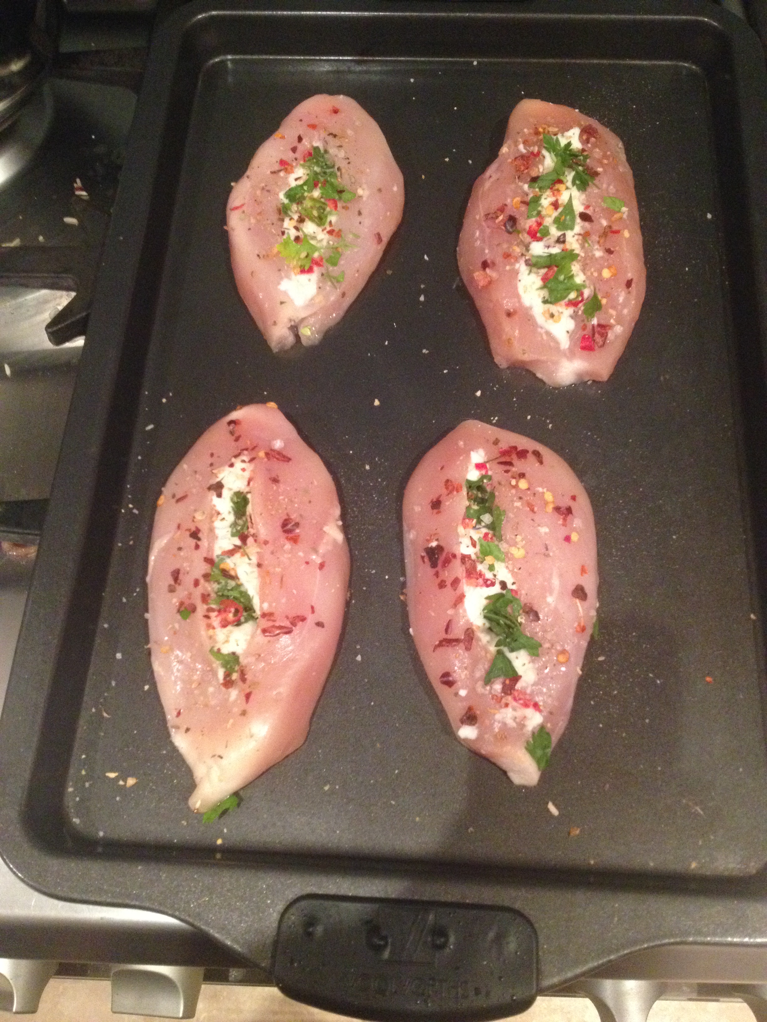 On a plastic chopping board with a sharp knife, gently cut into the centre of the chicken breast, do not cut all the way. Stuff the breast with a a generous amount of mozzarella, chopped parsley and red chili. Once the breasts are stuffed, season with sea salt, black pepper, chili flakes and dried rosemary (a tiny bit).