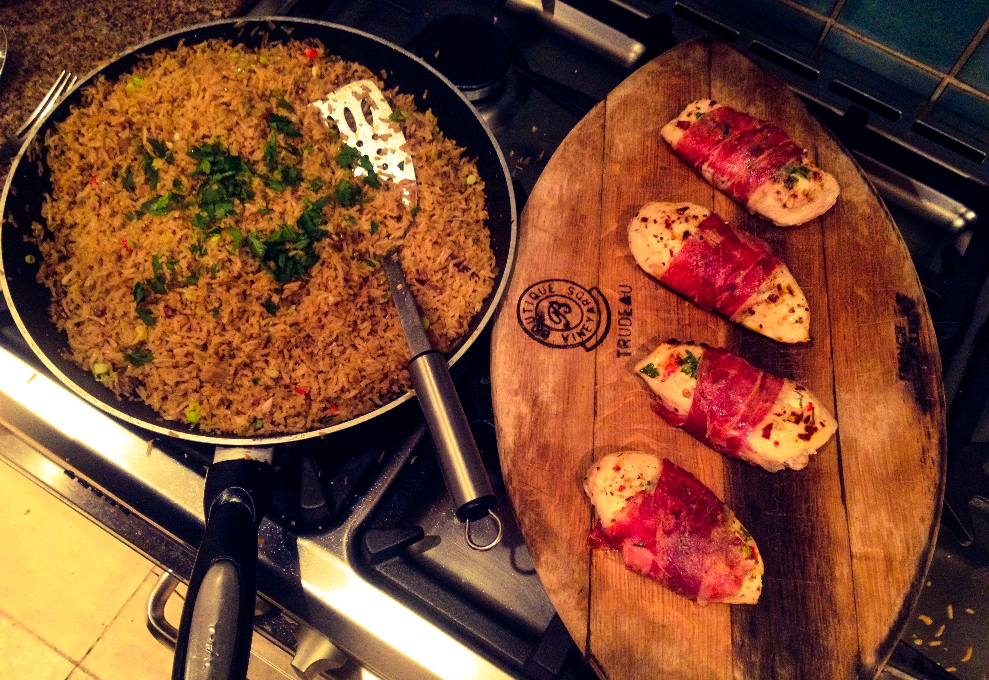 Lay one end of the Parma Ham under the chicken breast and tightly roll it until the two ends meet. Place the frying pan onto high-heat and add 1 tbsp of olive oil, fry the chicken breasts on each side for 3-5 minutes depending on the thickness of the breast. Once they have been sealed, place them on the baking tray and bake for 10-12 minutes.