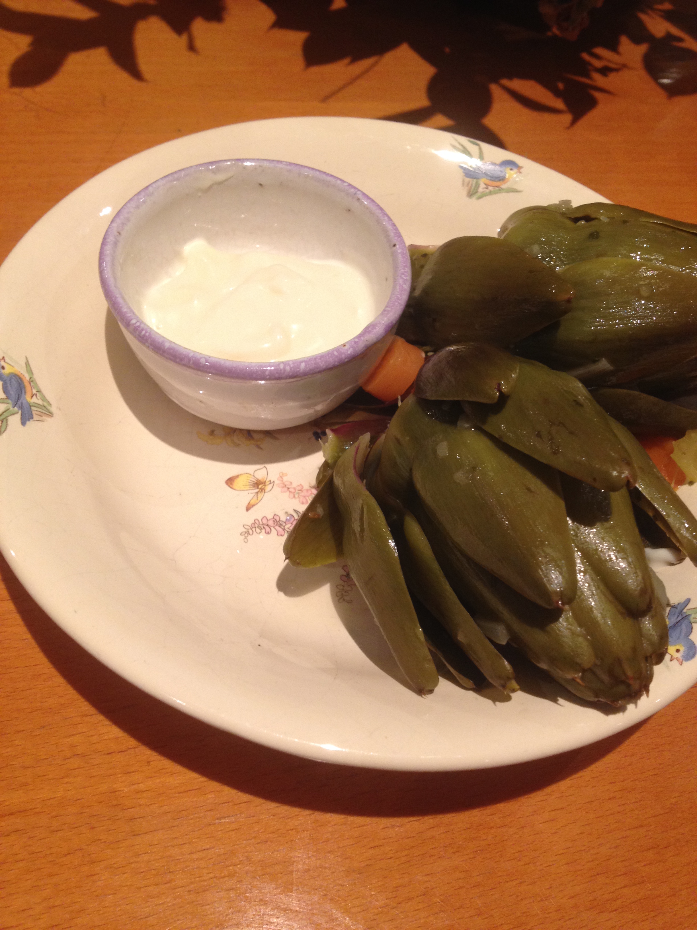 Artichokes may be eaten cold or hot, but I think they are much better hot. They are served with a dip, either melted butter, mayonnaise or egg mayo.