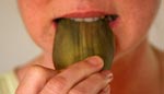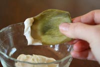 2. Dip the white fleshy bit into the dip. Tightly grip the other end of the petal. Place in mouth, dip side down, and pull through teeth to remove soft, pulpy, delicious portion of the petal. Discard remaining petal.