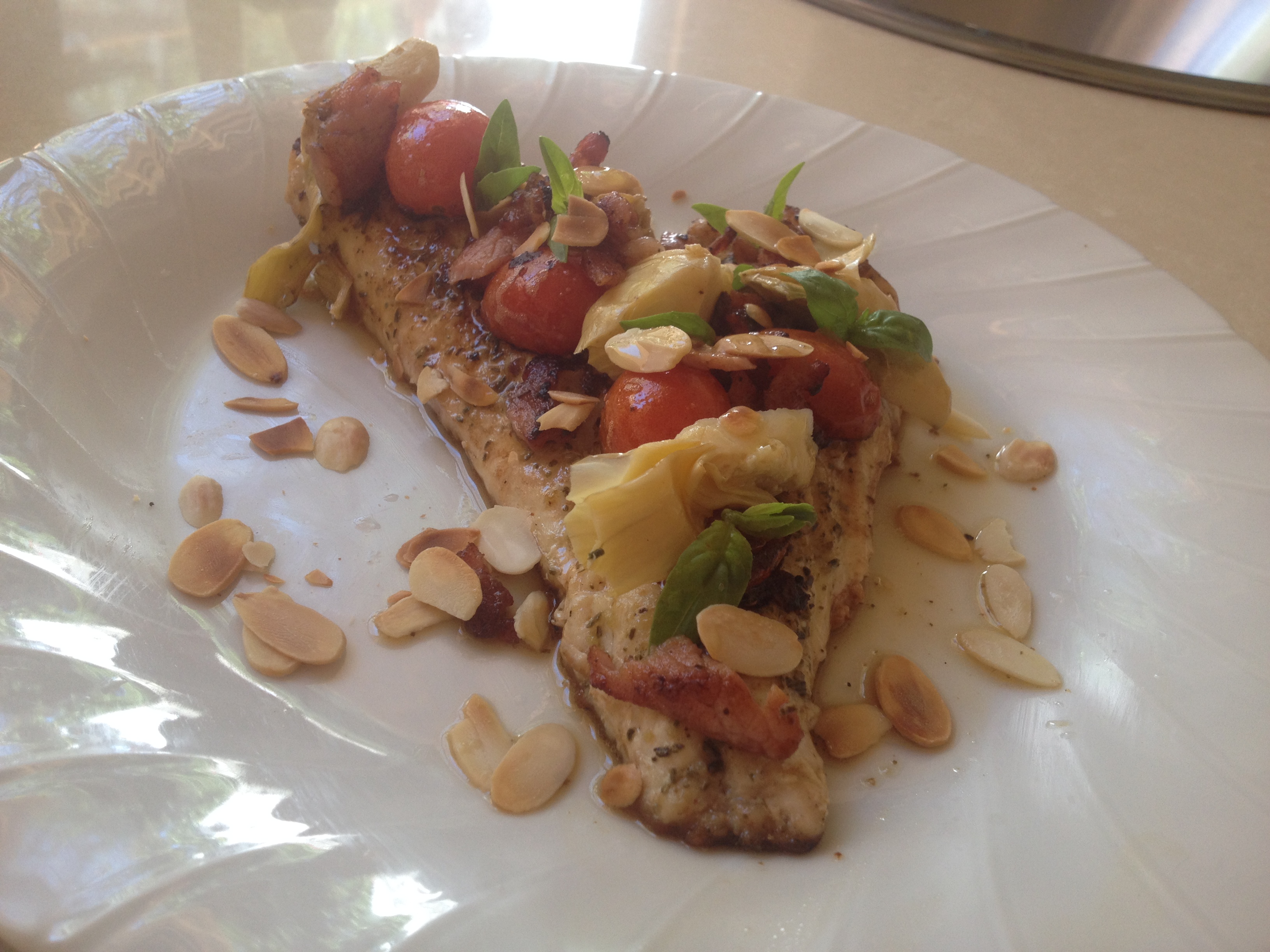 Plating the dish: Place the fish in the centre of the plate, on top of the fish place the roasted tomatoes, bacon bits and artichokes, sprinkle with fresh basil and the roasted almonds. Drizzle some extra virgin olive oil and some lemon juice. The flavours are so beautifully delicate, enjoy every mouthful, can be served with rice or baby potatoes.