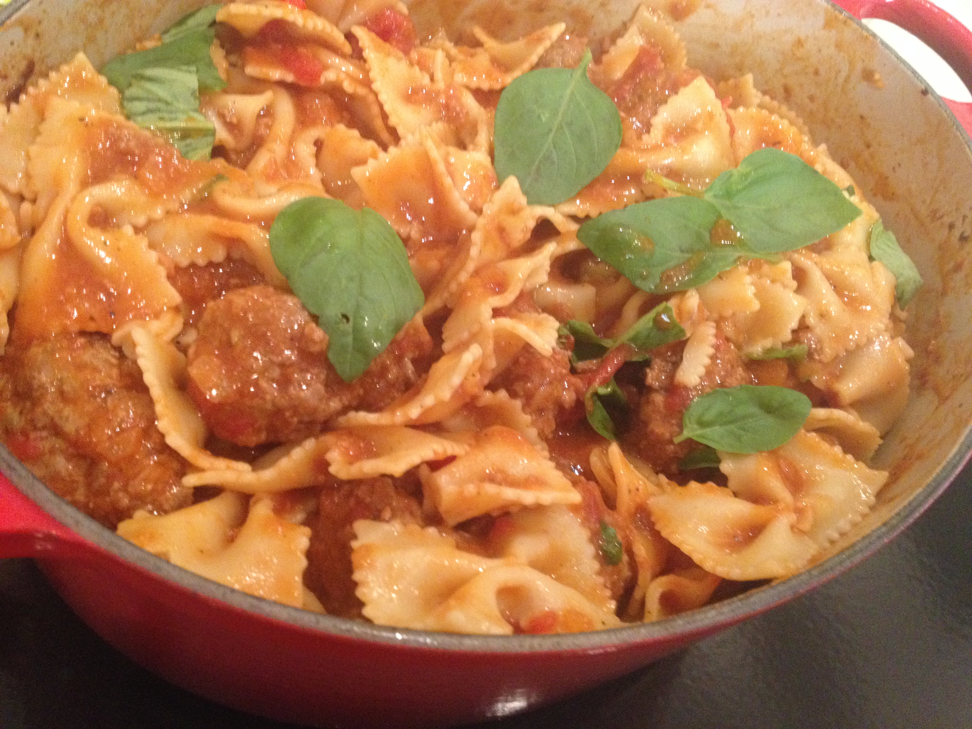 While the sauce is cooking, heat the large frying pan and add a lug of olive oil and the meatballs. Stir them around and cook for 5 minutes until golden. The add the meatballs into the sauce, cover with tinfoil and place the lid on, cook in the oven for 20 minutes.