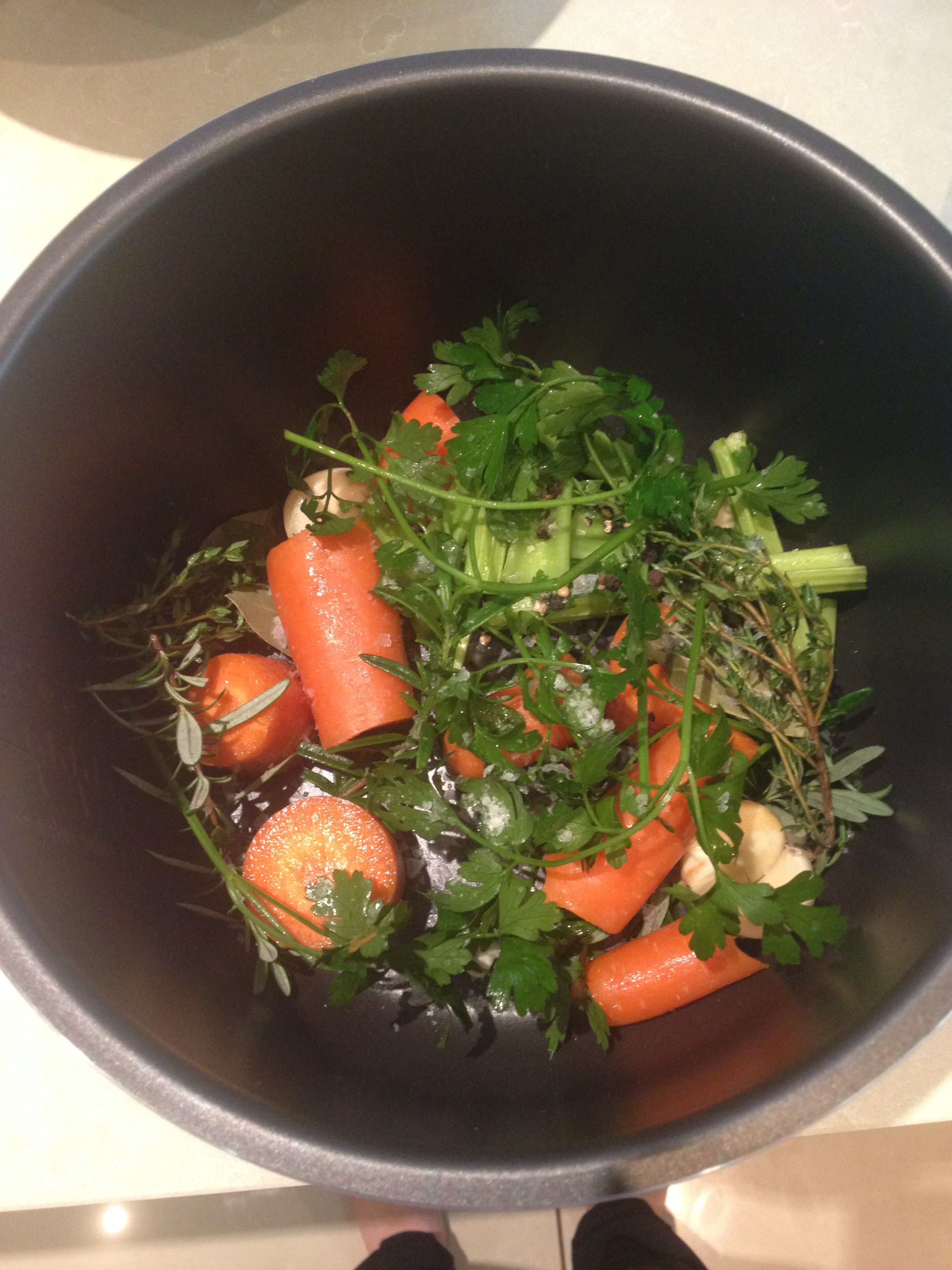 Place the frying on high-heat. Season the chicken wings with salt and pepper and cook them until nicely browned. Once cooked drain off any extra fat. Then, in the pot/pressure cooker add the chicken carcasses, wings, garlic, vegetables, herbs, peppercorns, 1 tsp sea salt and water.