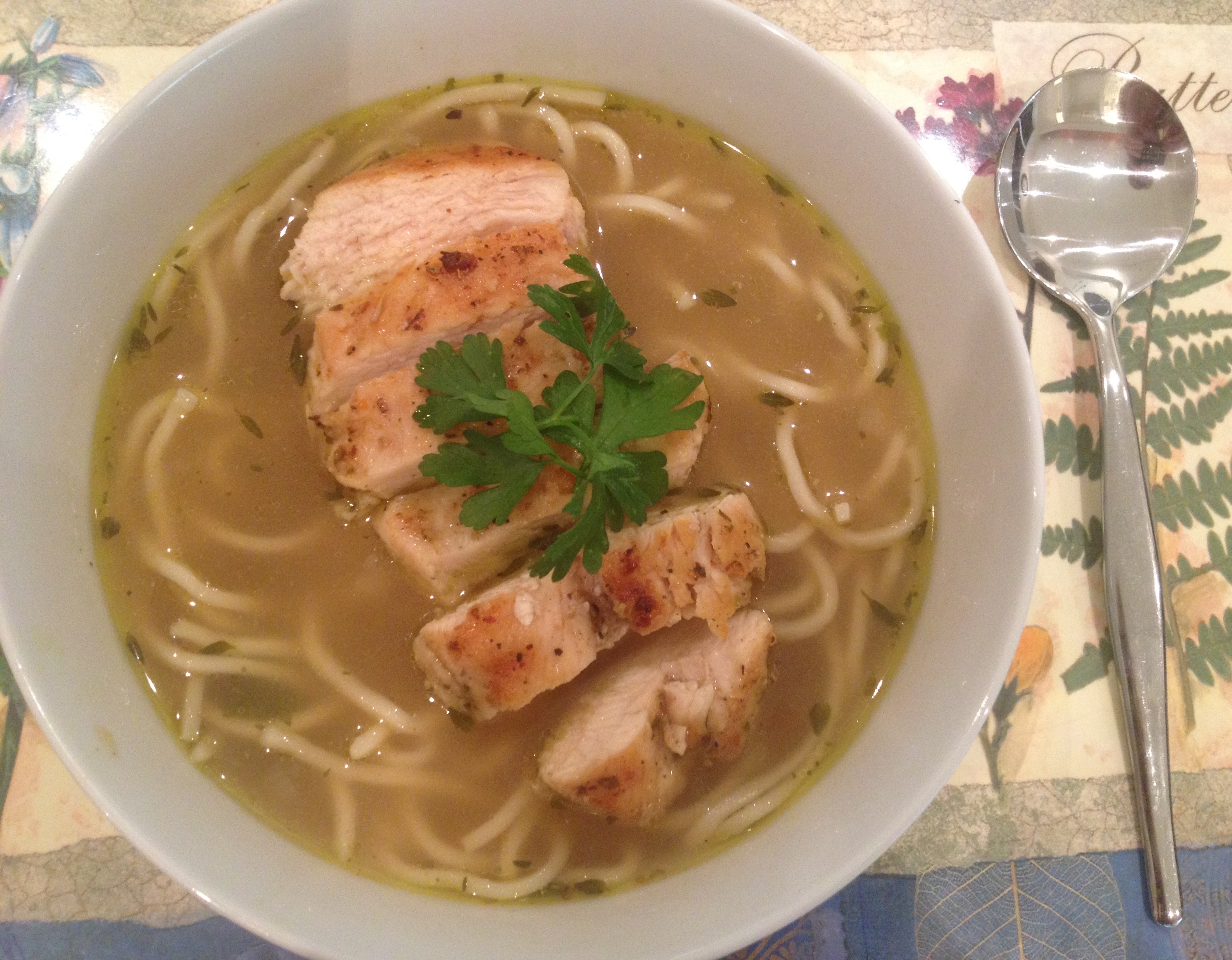 Place the griddle pan on high-heat. In a glass bowl add the oregano, olive oil, salt and pepper, and the whole chicken breasts. Once the pan is hot cook on each side for ±5 minutes. In separate bowls add a generous amount of soup and noodles along with the sliced chicken breast and fresh parsley.