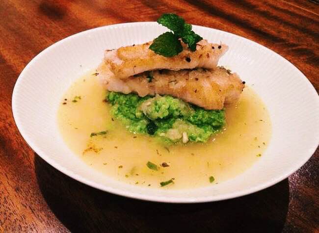 To dish up divide the broth between four shallow dishes. Then place a large spoonful of pea puree into the centre of each bowl. Place the hake portion on top of the puree and serve immediately.