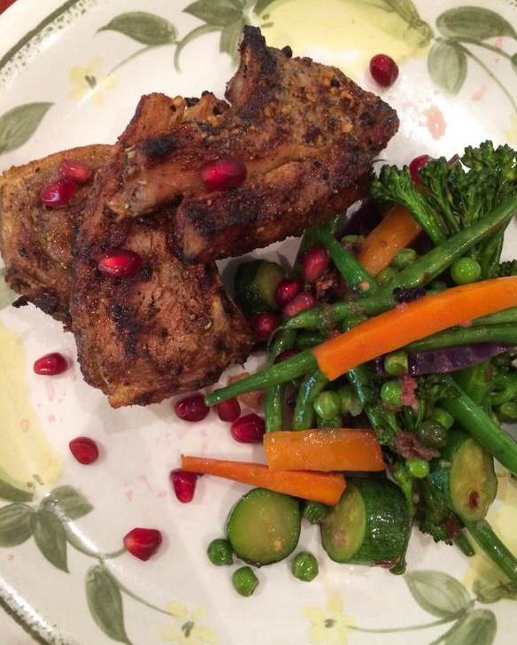 To dish up, squeeze the lemon over the vegetables and sprinkle the pomegranate gems over the chops and veggies.