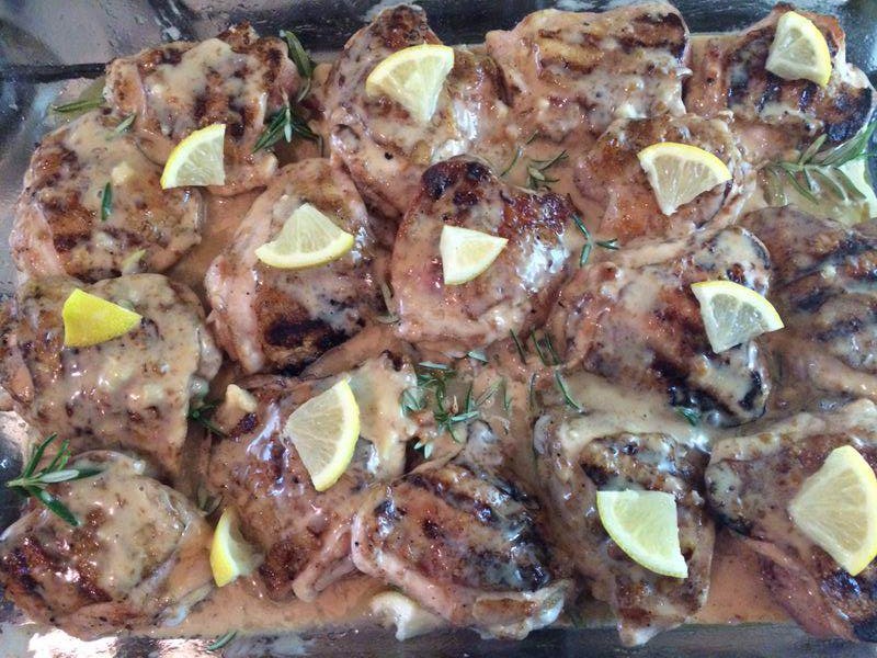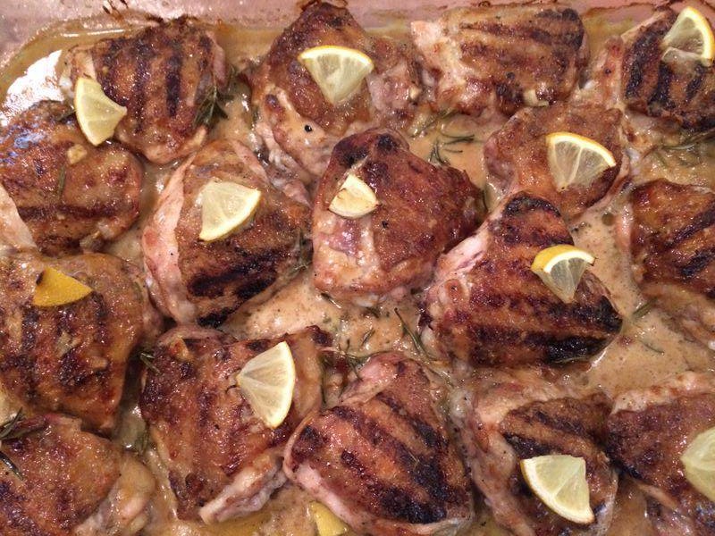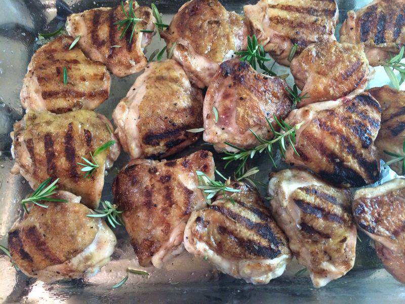 While the chicken is browning, mix all the sauce ingredients together. Once the chicken has browned, place the thighs skin side up in the dish, sprinkle with the fresh rosemary and cover with the sauce.