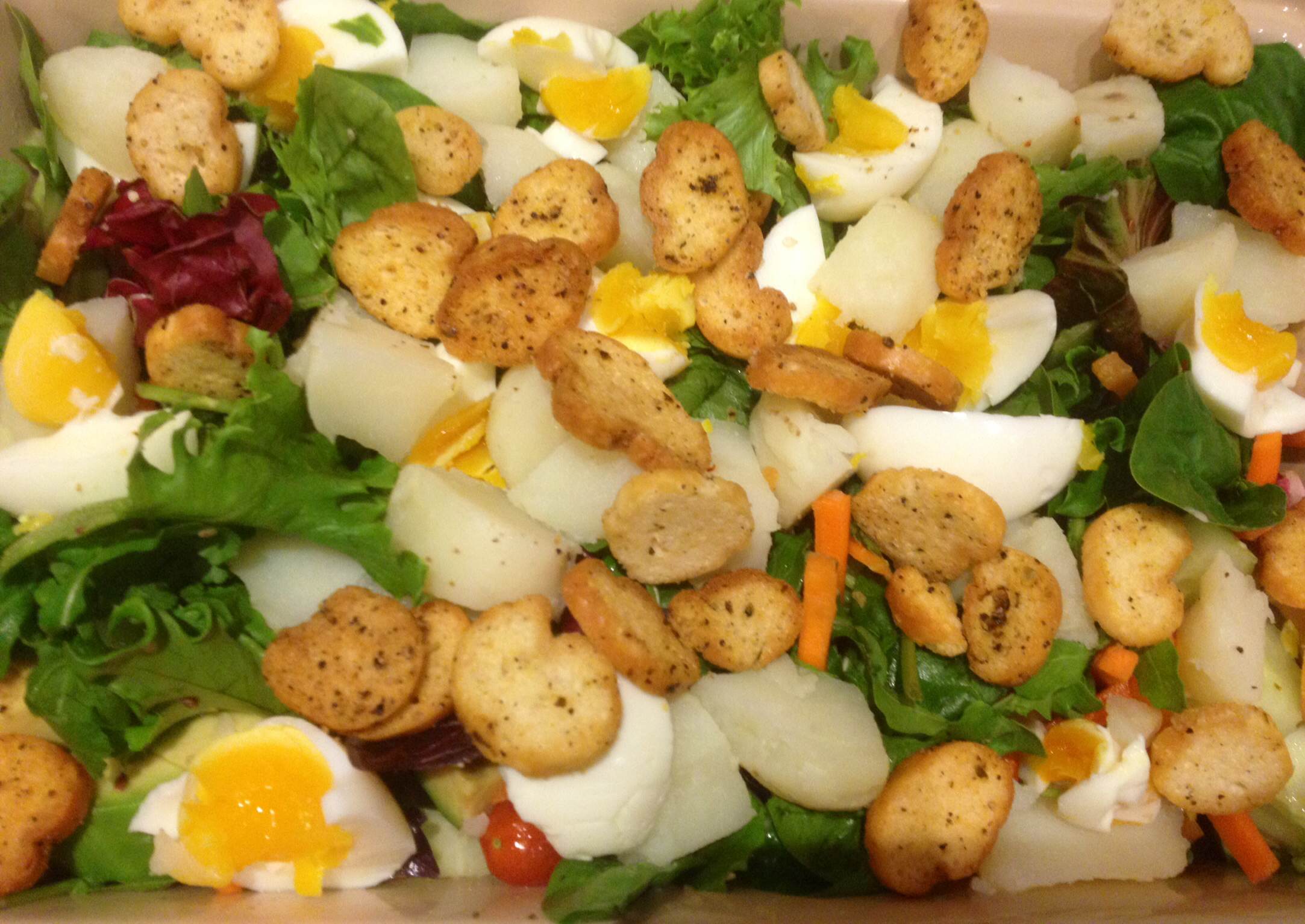 Once the potatoes and the eggs are boiled, peel, cut and place them in the salad with the croutons and the avocado. In a seperate bowl add the tuna, the juice of 1 lemon, olive oil, balsamic vinegar and salt and pepper.