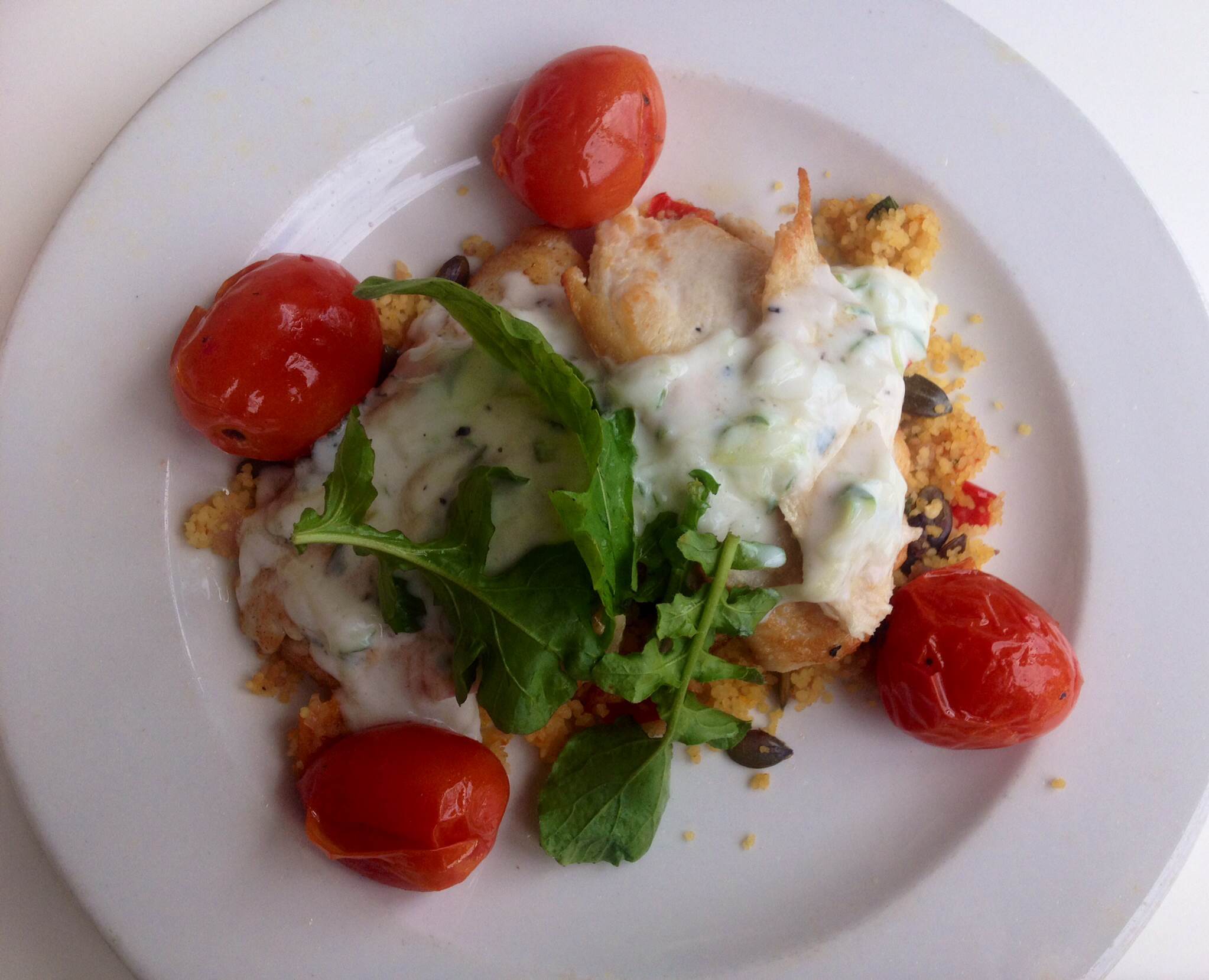 To plate up, split up the couscous between two plates, place the chicken on top and serve with the raita and some fresh rocket.
