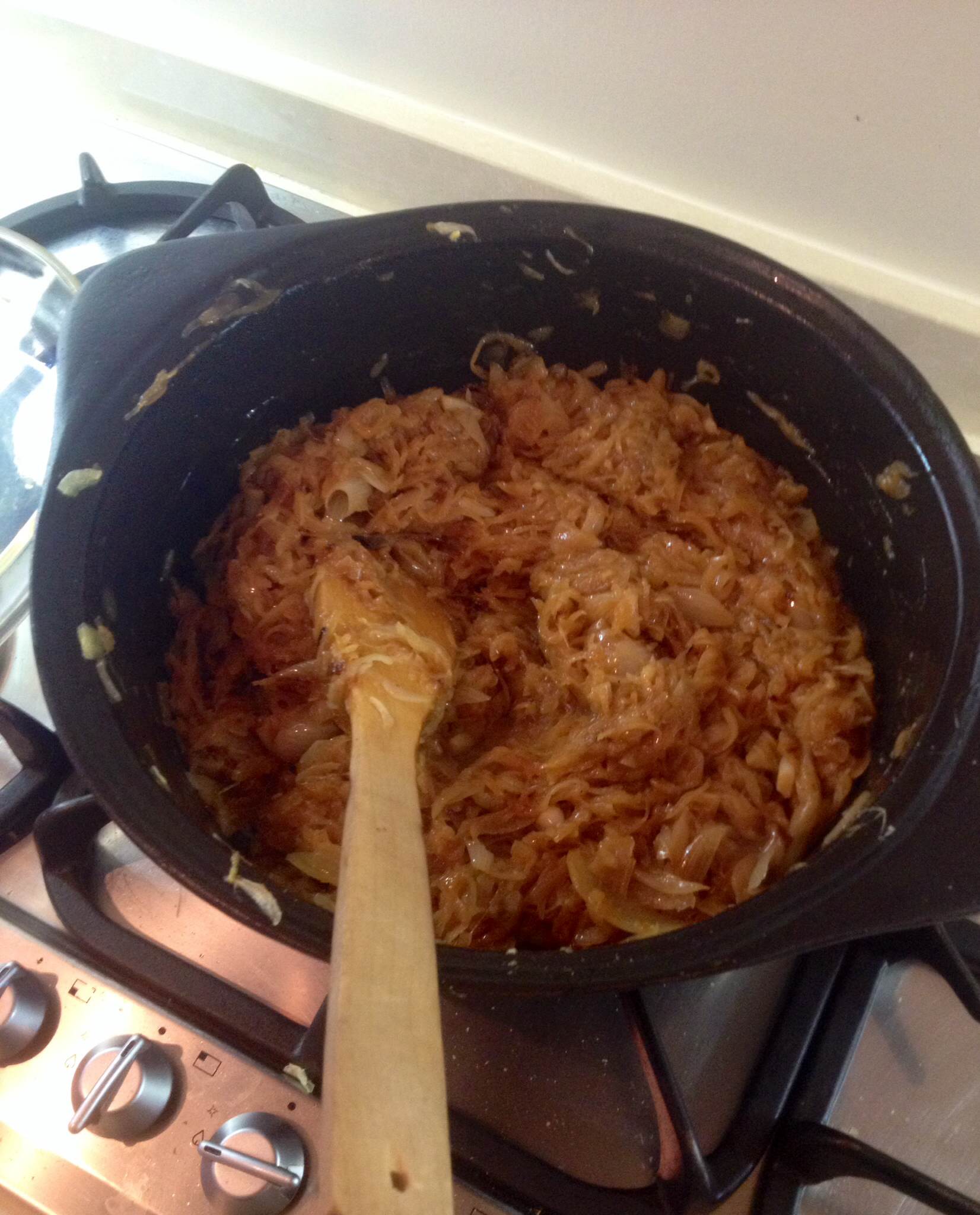 After 30 minutes you may want to add more oil, you will find that the onions will start sticking to the pan and you will have to stir more often. Once they are soft and brown, add a little balsamic vinegar to help deglaze the pan and bring some additional flavour to the onions.
