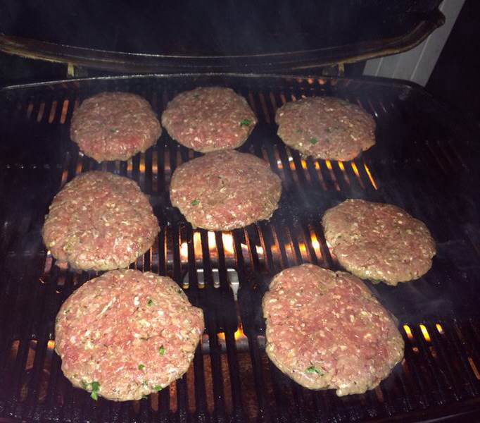 In a large bowl combine all the patty ingredients and thoroughly mix with your hands.  Each patty will be 200 grams so use the scale to measure, I usually use a small bowl to make the patty shape, the flatter the better! Place them on a tray that can fit in your fridge.  Once made, place in the fridge for at least 30 minutes.