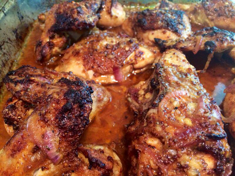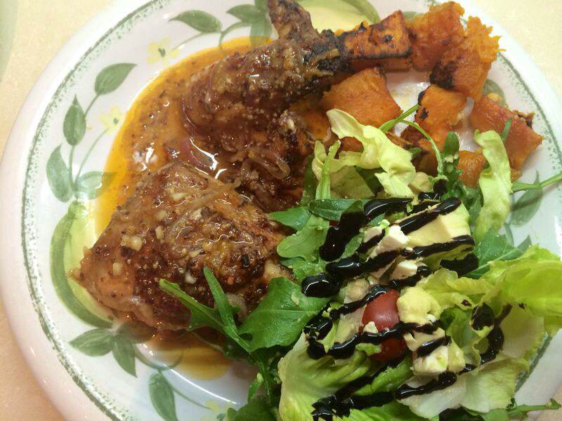 Some days I lack inspiration, when that happens I turn to my trusty fridge and pantry. It is so important to buy the staples and other delicious ingredients that keep well for those uninspiring days. Chicken is so versatile and when its smothered in garlic, honey, mustard and paprika you can’t go wrong. I served this chicken dish with roasted pumpkin and a rocket, iceberg, feta, cherry tomato and avo salad with balsamic creme.