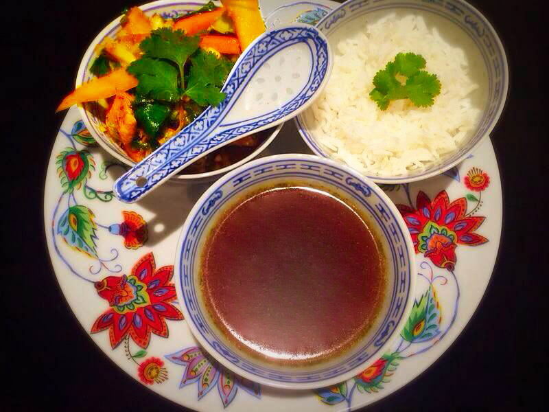 I served the broth separately so you can taste the amazing flavours, but you can spoon it over the rice and stir-fry.
