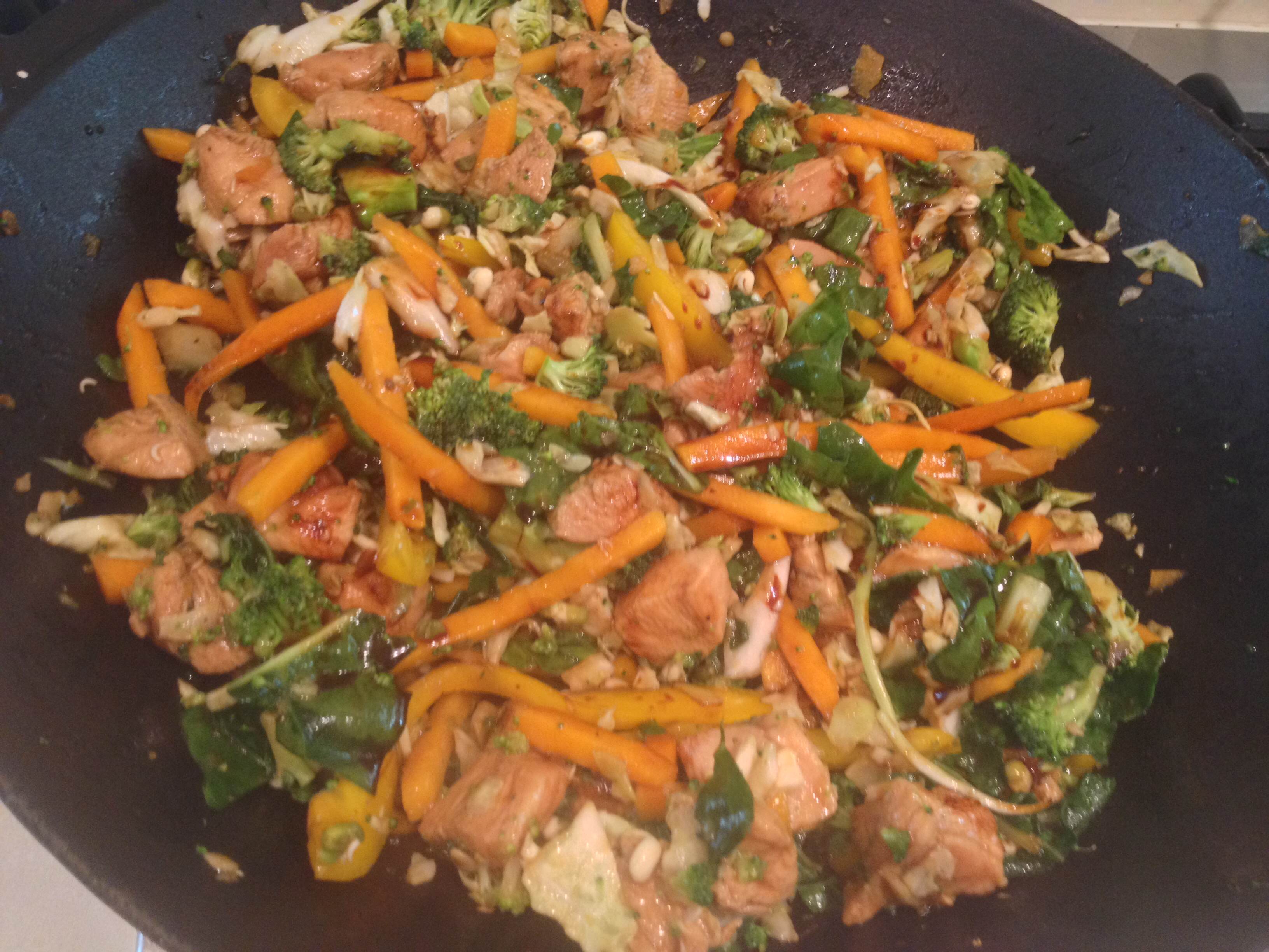 After the broth has been cooking for an hour, place a wok on high-heat and warm up 2 large lugs of olive oil. Stir fry the garlic, ginger and chilli for 30 seconds, then add the chicken and fry for 5 minutes.