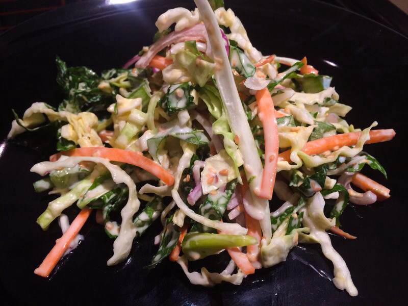 To make the slaw, mix together the mayo, yogurt, wasabi, lime juice, zest, sugar, and toasted sesame seeds. Then add all the cut up veggies. Seat aside. Make sure you don’t over doit with the wasabi, it will taste very strong and throw the balance of the flavour off.