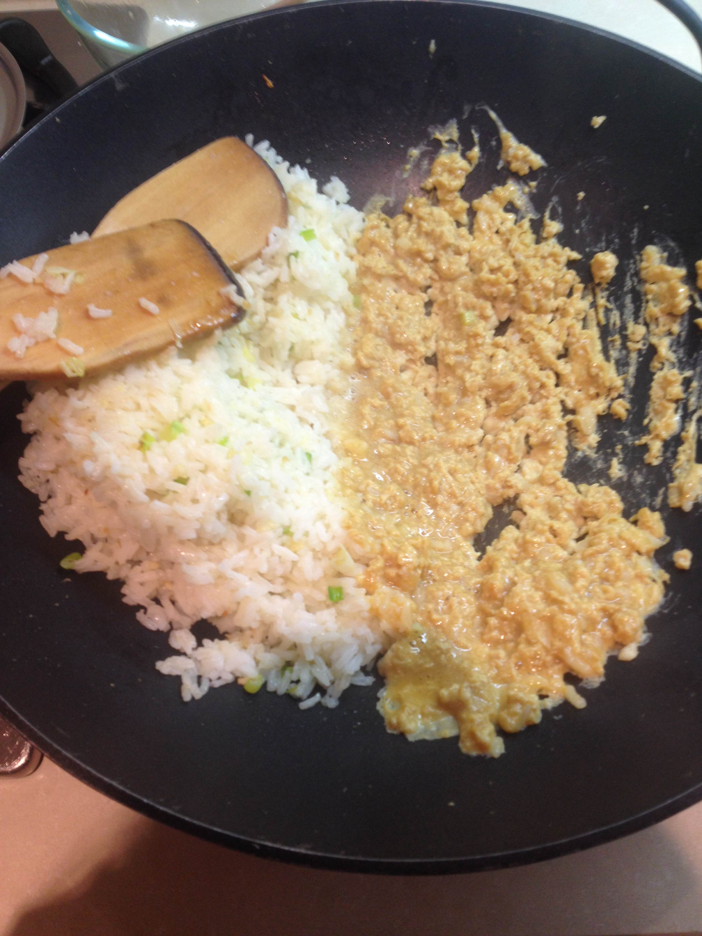 Then add the cooked rice, mix for another minute. Then push the rice to one side of the wok and pour the egg mixture into the other side. Using a chopstick, mix the eggs until little egg strands start forming, do this for 3-5 minutes. Then mix the rice with the eggs, taste and add more soy sauce if it needs more salt. Place in another warm dish.