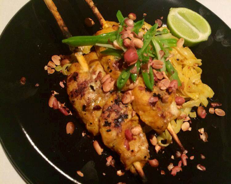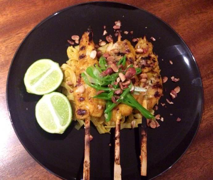 To serve: Evenly distribute the noodles, then place the fish skewers on top of the noodles, dress with the cooked greens, bashed peanuts and a wedge of lime.