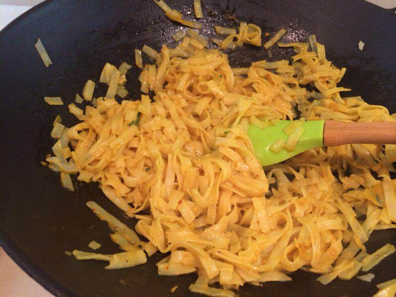 While the fish is cooking, place a pot on high heat with boiling water and cook the rice noodles for 3-5 minutes. Place a wok on high heat, warm up a teaspoon of olive oil and add the leftover marinade, cook for 1 minute then add the cooked noodles.