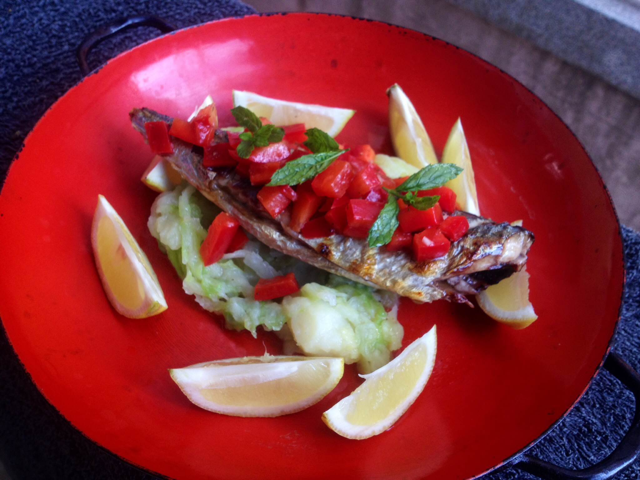 Place the cooked fish on top of the mashed veggies, put the fish on top and spoon over the red pepper mixture, sprinkle over the mint leaves and extra lemon.