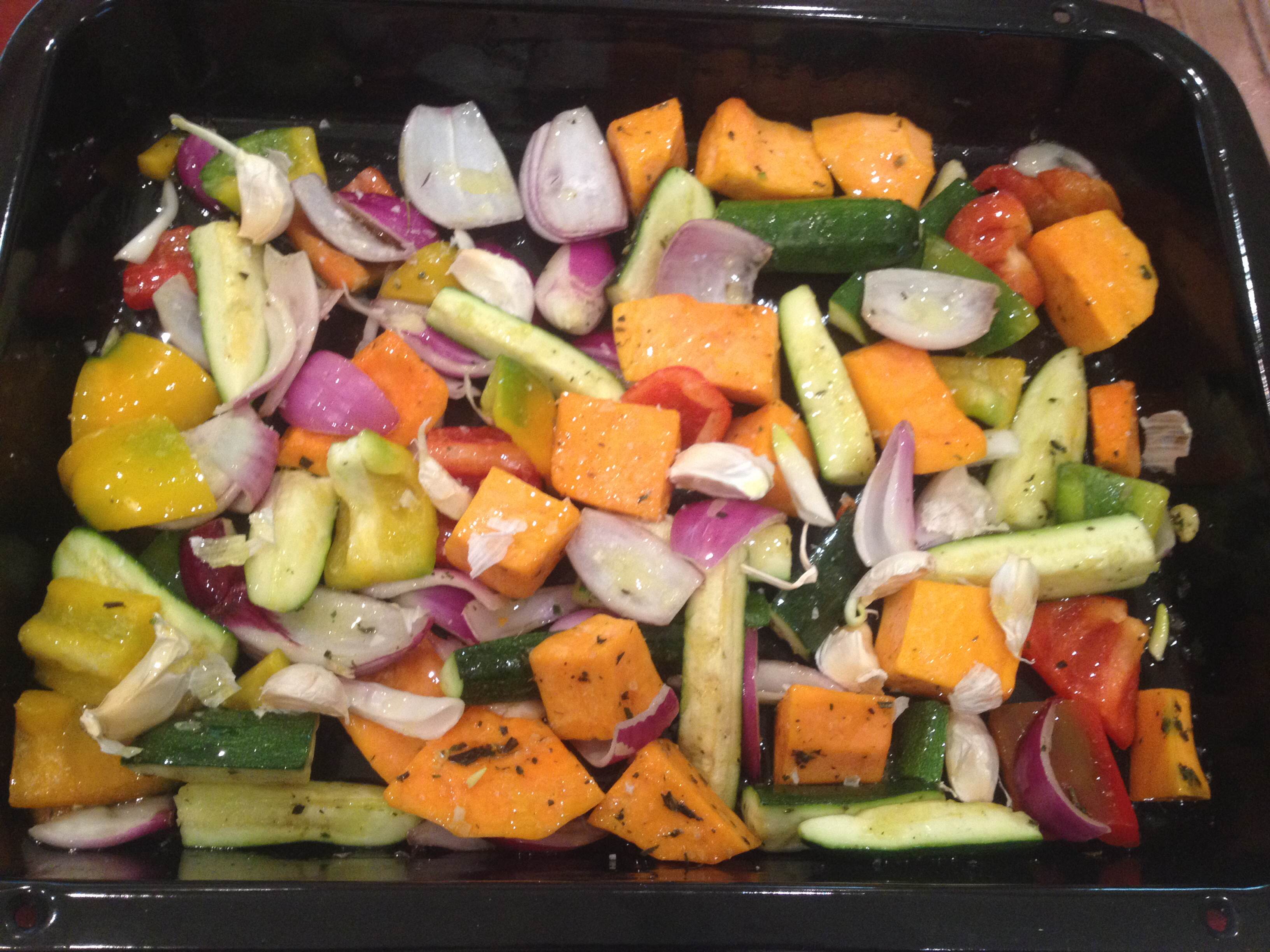 Chuck the veggies, garlic cloves and the baby tomatoes into big plastic bowl, add 2 tbsp olive oil, a generous pinch of salt and black pepper and mix. Transfer into an oven tray and place in the oven for 20 minutes.
