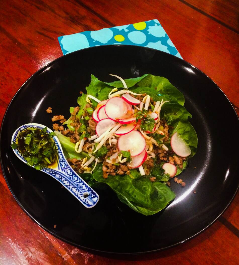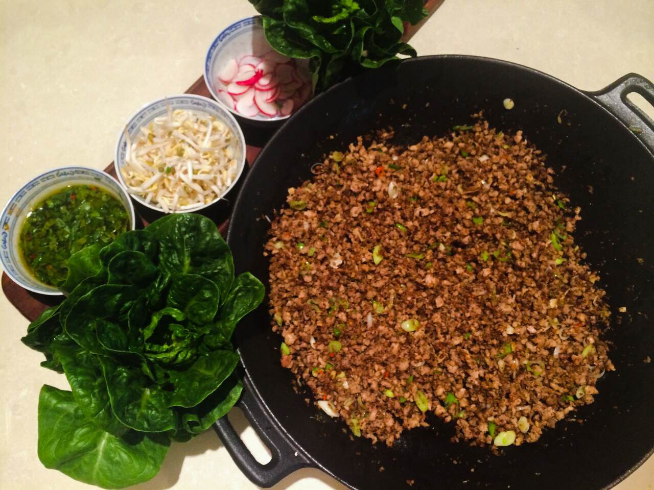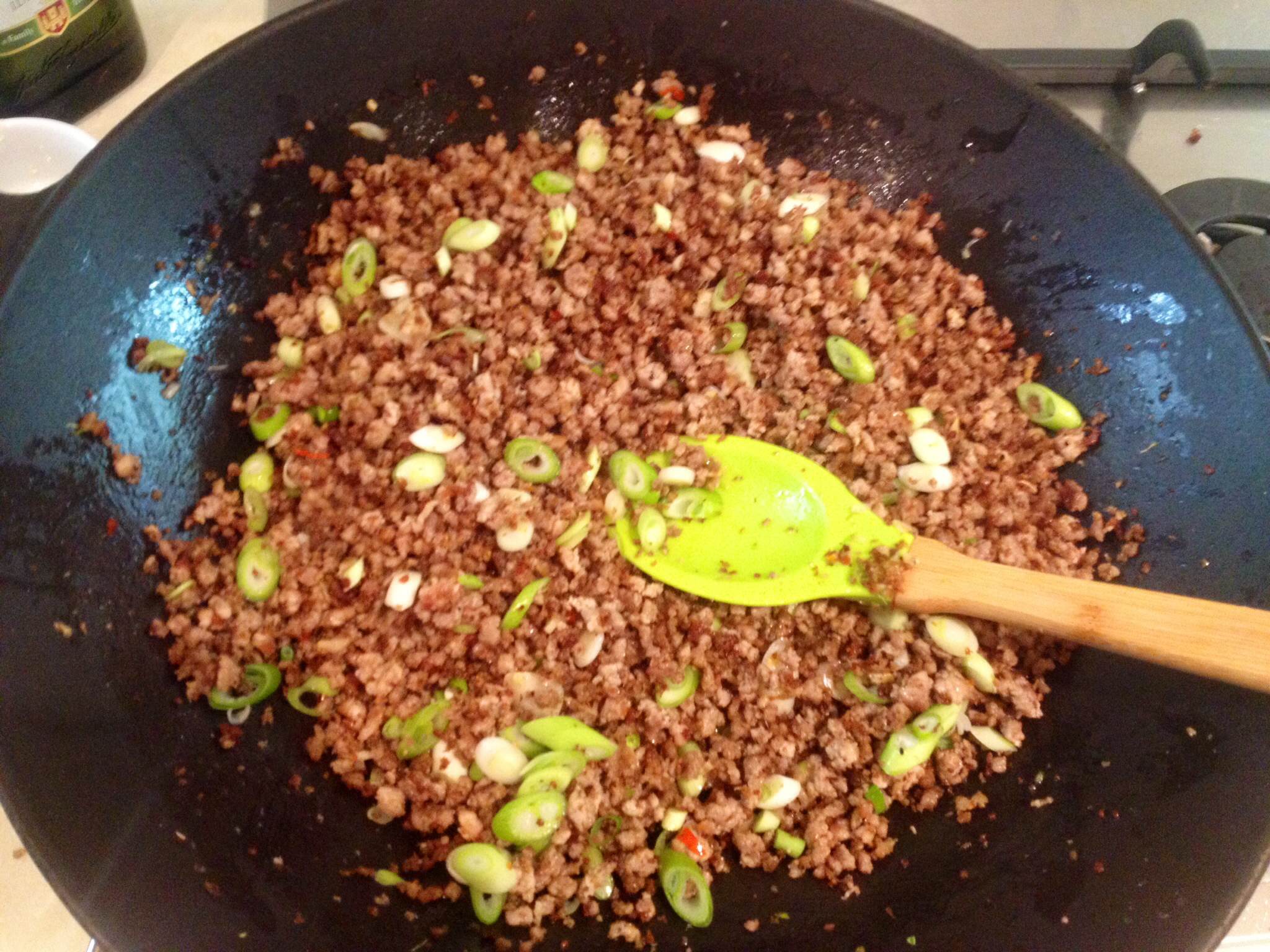 Wipe the pan, then add the sesame oil and a tablespoon of olive oil, when the oil has warmed up add the chopped chilli, ginger, garlic and brown sugar, fry for 1 minute (be careful not to burn the garlic). Then add the mince, fish sauce, lime zest and juice and toss for another 30 seconds. Then add the spring onions and toss.