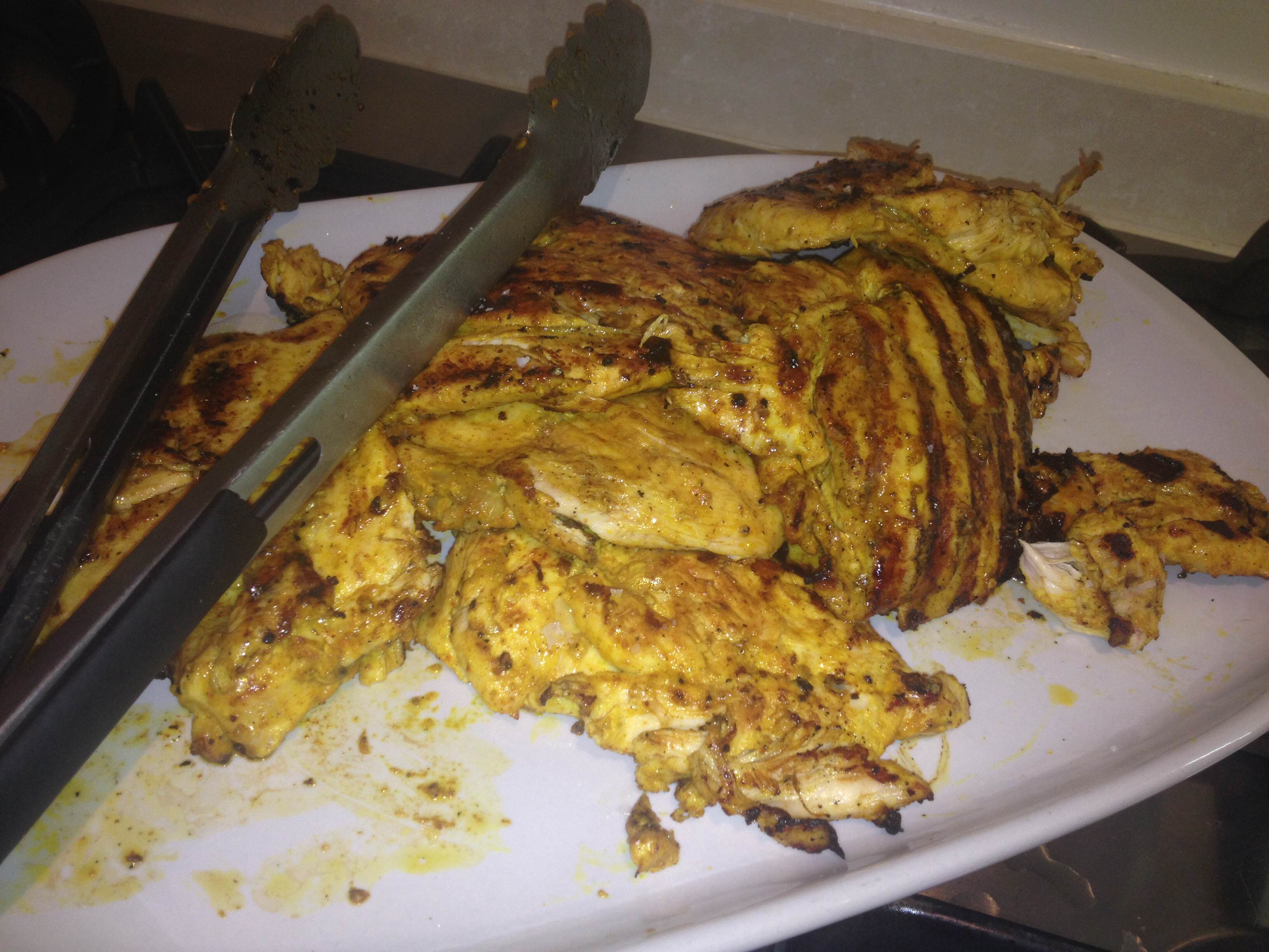 In a large marinating dish, mix together the turmeric, paprika, cumin, chilli powder, a generous pinch of sea salt, black pepper and the yogurt. Then on a plastic chopping board butterfly the chicken breasts. Then massage the marinade into the chicken, cover and place in the fringe for at least an hour.
