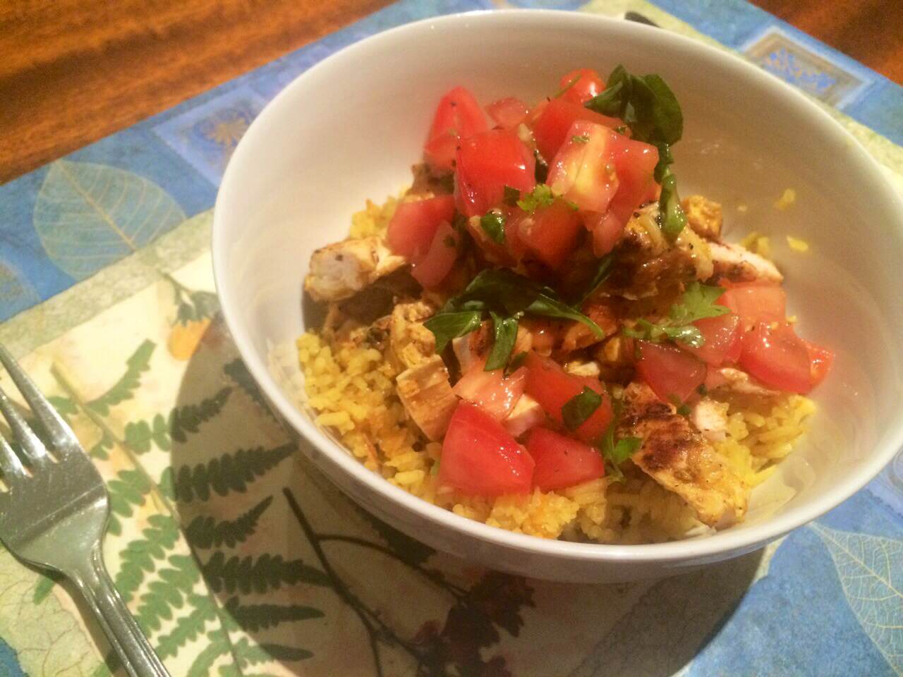The rice should be cooked, adjust the flavour to your liking, I always add a bit more salt. To dish up spoon a generous amount of rice into a bowl or a plate, top with chicken strips and a tablespoon of fresh salsa, and a dollop of fruit chutney.