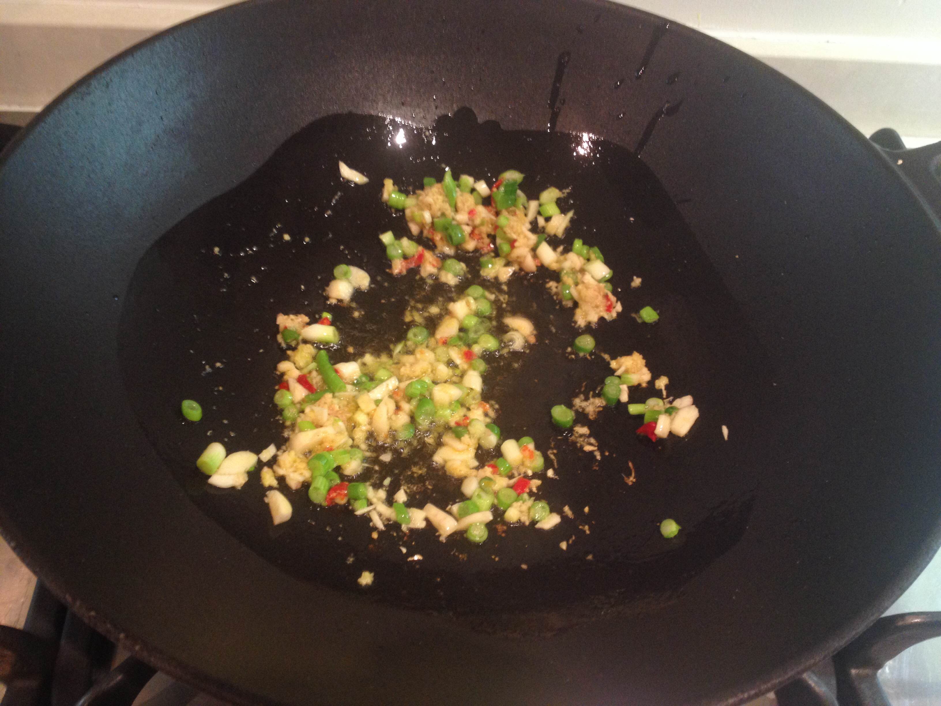 Place a large wok on high heat, add 2 tablespoons of olive oil, heat it up for 30 seconds, then add the garlic, ginger, chilli and spring onions. Fry for 1 minute.