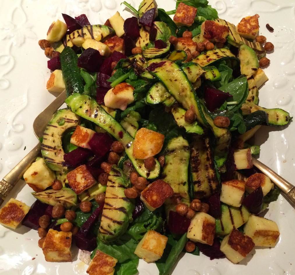 Take the beets out of the oven and let them cool. Make the dressing by combining all the ingredients, and the roasted garlic from the beets, then slowly drizzle in the olive oil. In a bowl add the greens and half the dressing, toss and then place on a large serving dish, top with the griddled courgettes, avo and once the beets have cooled, cut them into cubes and add the to the salad with the halloumi cubes, the toasted chickpeas and the rest of the dressing.