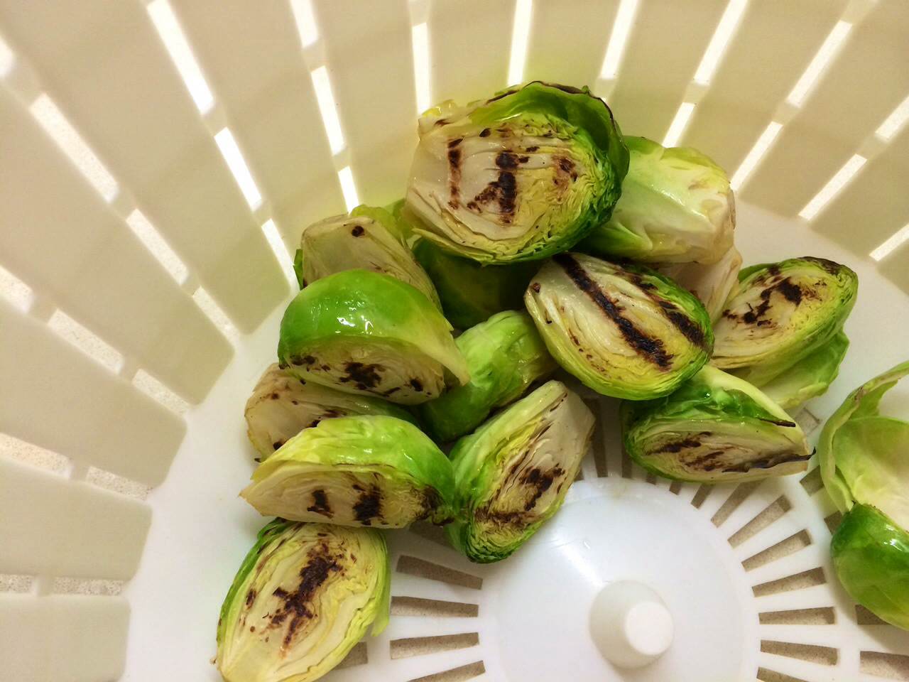 Thoroughly wash the sprouts, then cut them in half. Place a griddle pan on high-heat, using a basting brush rub the pan with olive oil. Then drizzle a small amount of olive oil onto the halved sprouts and griddle them for 5 minutes– or until slightly charred. Do them in batches if your pan is too small. You’ll start smelling a gorgeous nutty aroma in the kitchen 🙂