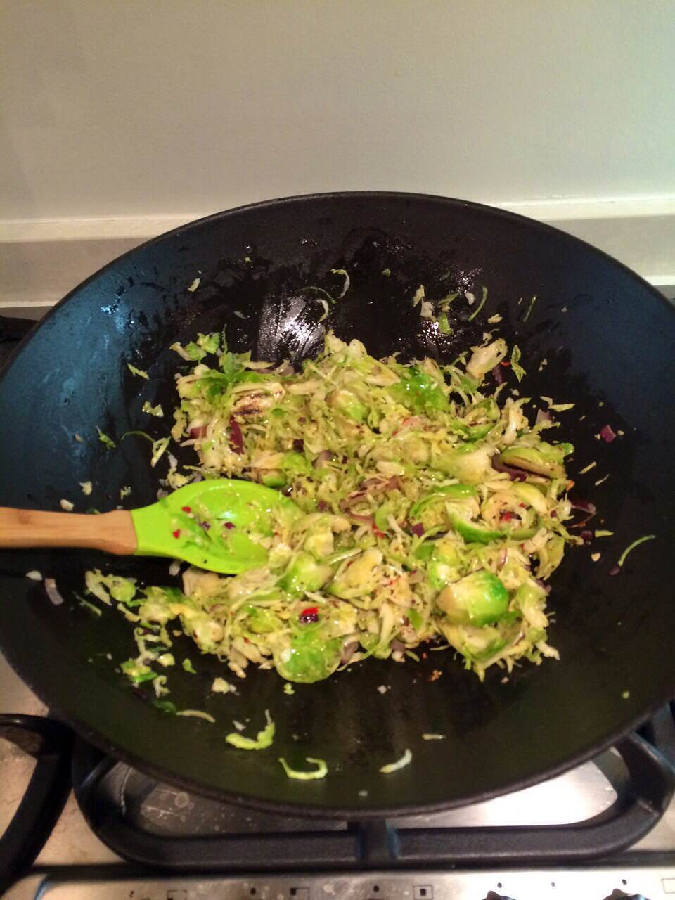 While the sprouts are charing, chop up the chilli, onions and garlic. Once the sprouts are grilled, using a food processor with the slicing attachment, finely sliced the chargrilled spouts. Place a large wok on high heat, add 2 tablespoons of olive oil and fry the garlic, onions and chilli for 3 minutes. If you want to add bacon to the mix, fry the bacon for 2 minutes before you add the chopped veggies.