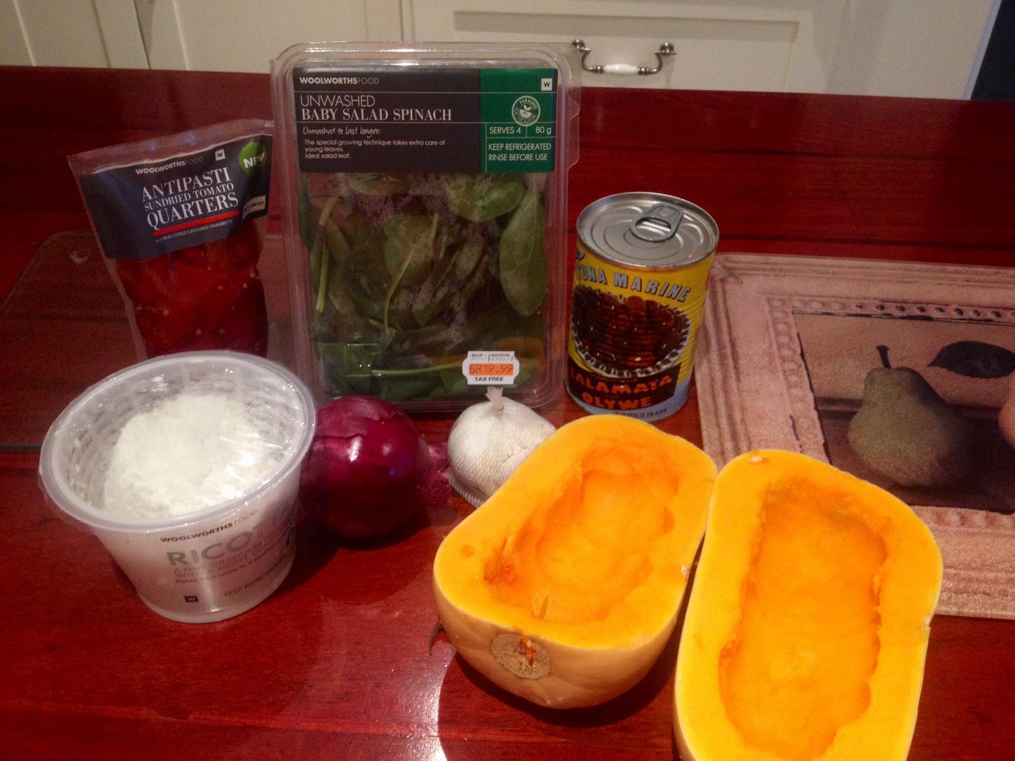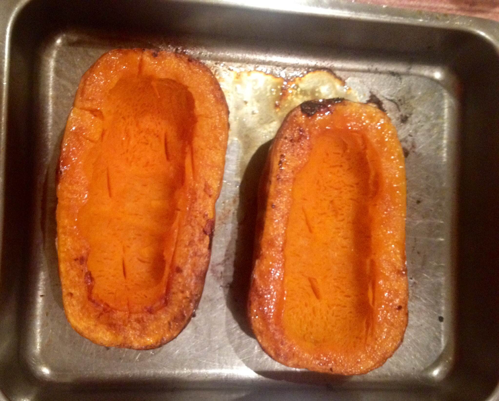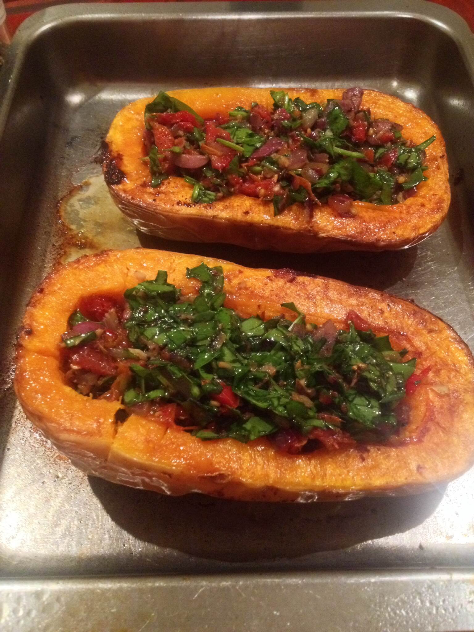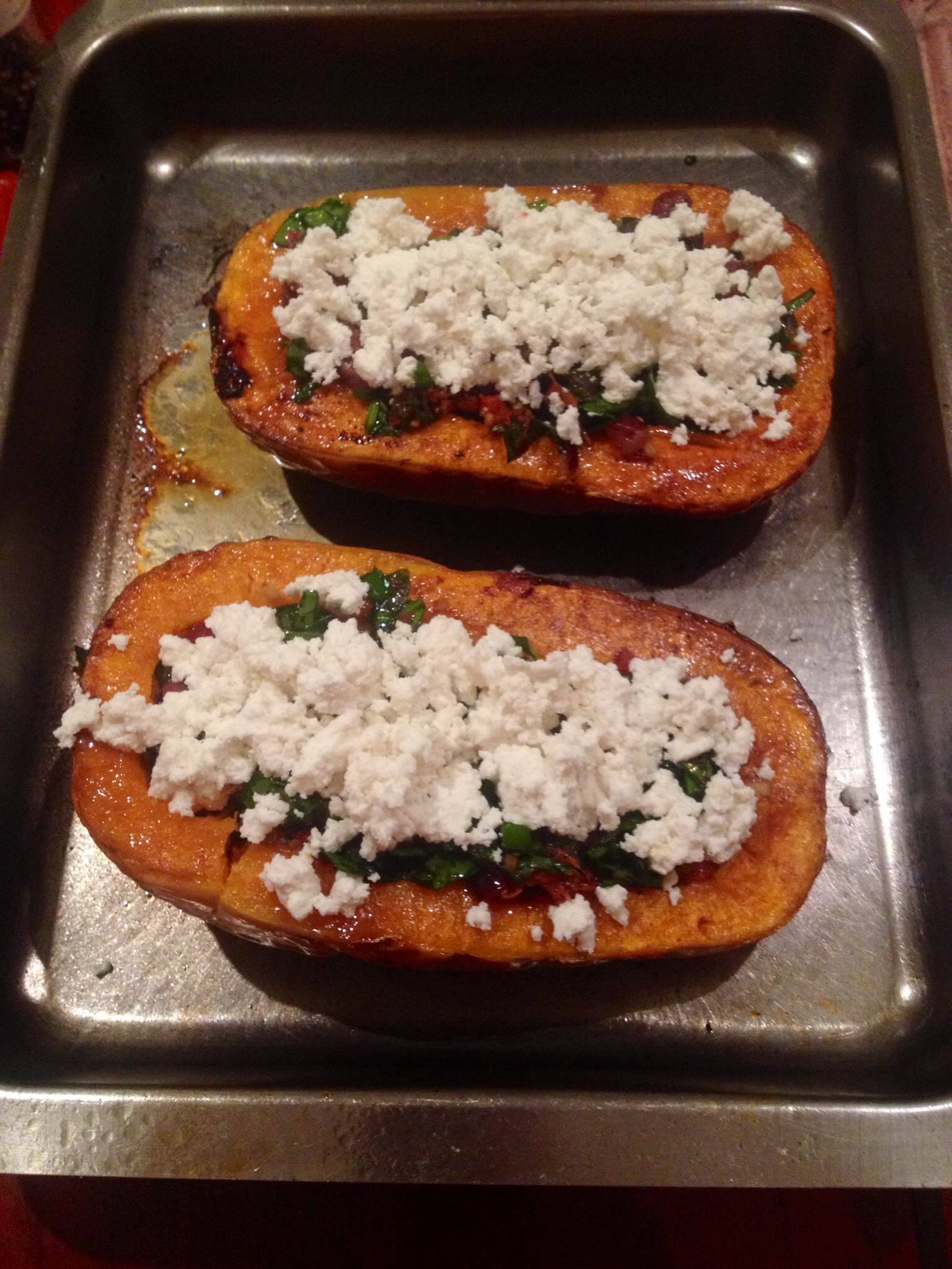 Halve the butternut, scoop out the seeds and some of the flesh so that enough filling can be spooned in.