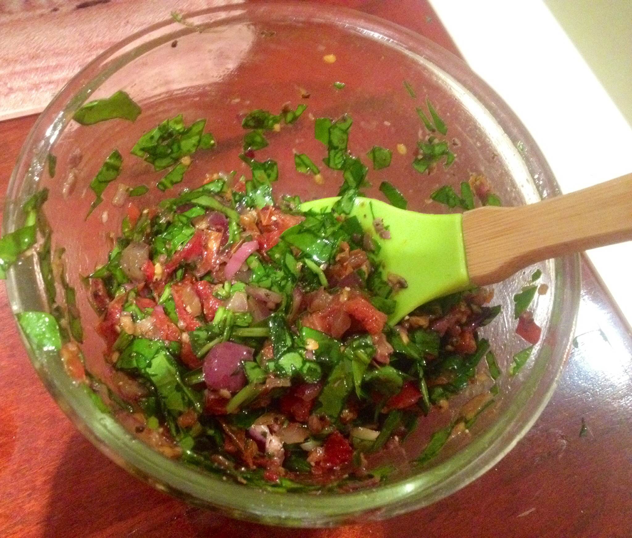 While the butternut is roasting, place a nonstick frying pan on high heat, add 1 tbsp of olive oil and fry the chopped onions, garlic and chilli for 5 minutes.  Then add the chopped olives and fry for a further minute. Set aside.  Then roughly chop the baby spinach and the sun-dried tomatoes. Place the fried ingredients into a glass bowl with the spinach and sun-dried tomatoes and a generous pinch of sea salt and black pepper.