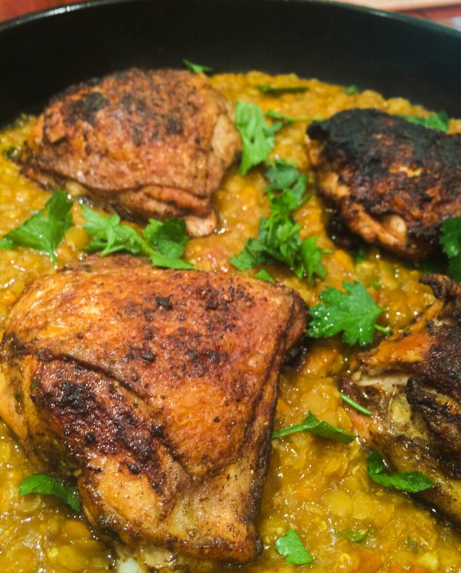 When the lentils have finished parcooking, add the onion, carrots, garlic, ginger, Berbere spice, salt and chopped tomatoes. Reduce heat to medium and cook covered for another 30 minutes, or until most of liquid is absorbed. Stir in fresh lemon juice and roughly chopped parsley. Season with extra sea salt and  fresh ground pepper. Place the cooked chicken on top of the lentils and take to the table.