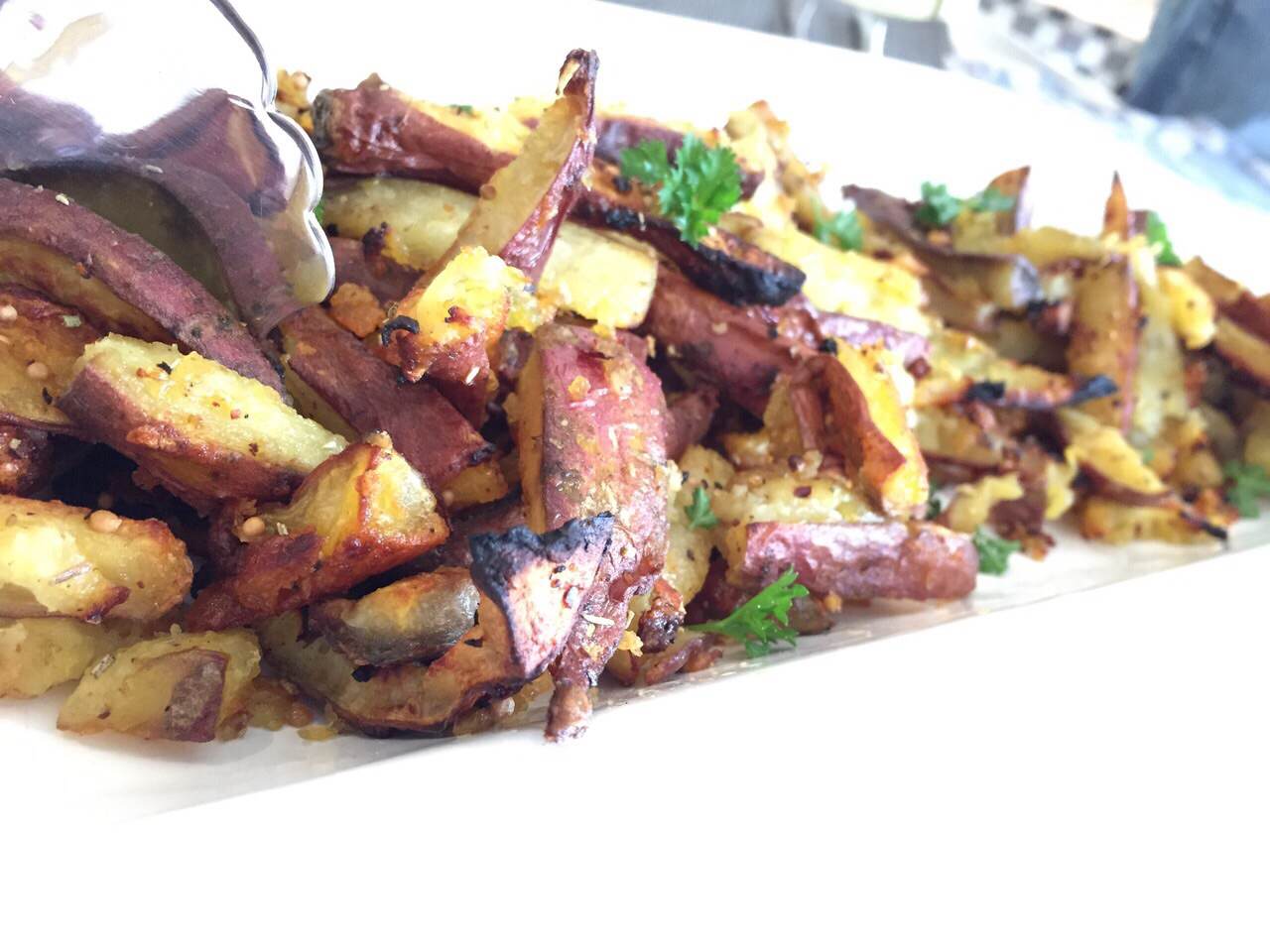 Roughly chop the potatoes, place on a large oven tray, then cover in all the spices and olive oil, toss and place in the oven for 30 minutes.