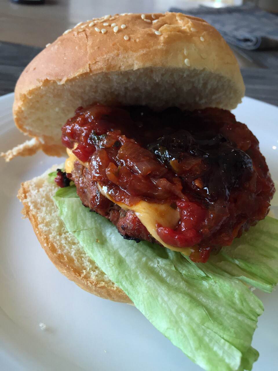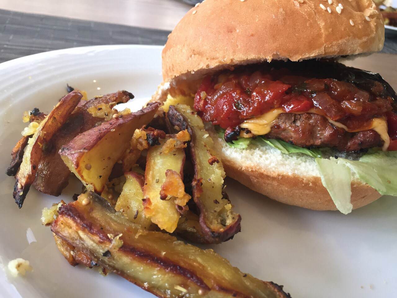 Burgers are always amazing, especially when they are topped with a rich and tangy tomato relish. When I was in Croatia they don’t serve their burgers with bread, so don’t be fooled by it, the meat and the toppings make an excellent week night meal. I paired it with spicy sweet potato fries (I am crazy about them).