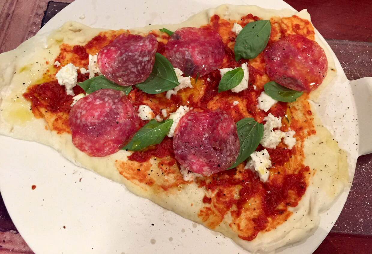 Once the sauce has finished cooking, lay out your pre-rolled pizza dough, using a basting brush, coat the pizzas with as much tomato sauce as you want, make sure you leave enough space so a nice crust can form. Tear chunks of mozzarella and place it on the pizza, top with chilli, salami, fresh basil and as much onion marmalade as desired, drizzle with some olive oil and season with salt and pepper.