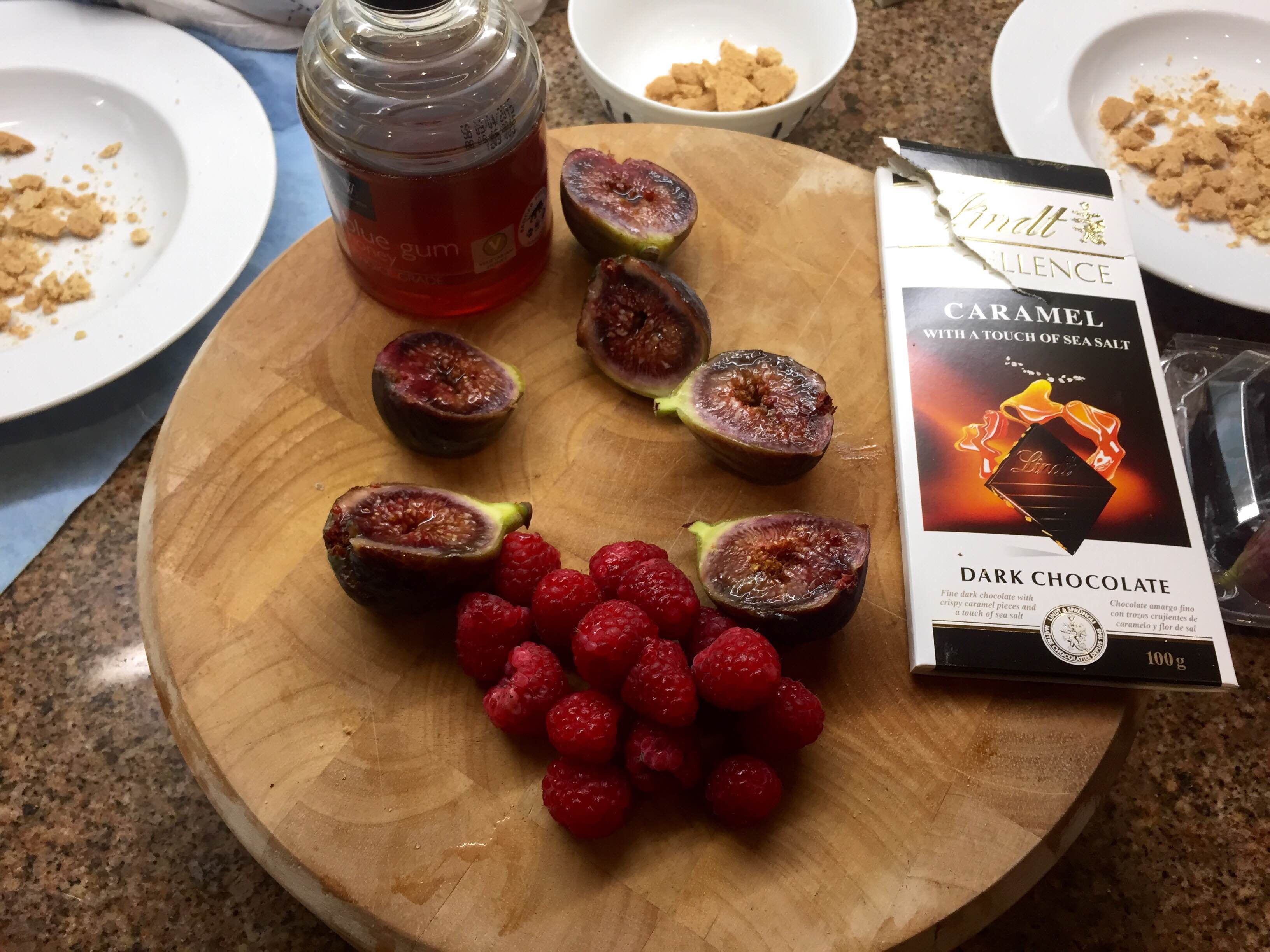 While the figs are grilling, break up 1-2 biscuits and distribute the crumbs into seperate bowls. Add 1-2 tablespoons of yogurt, the grilled fig, raspberries and chocolate, top with basil leaves a tiny dollops of honey, serve immediately.