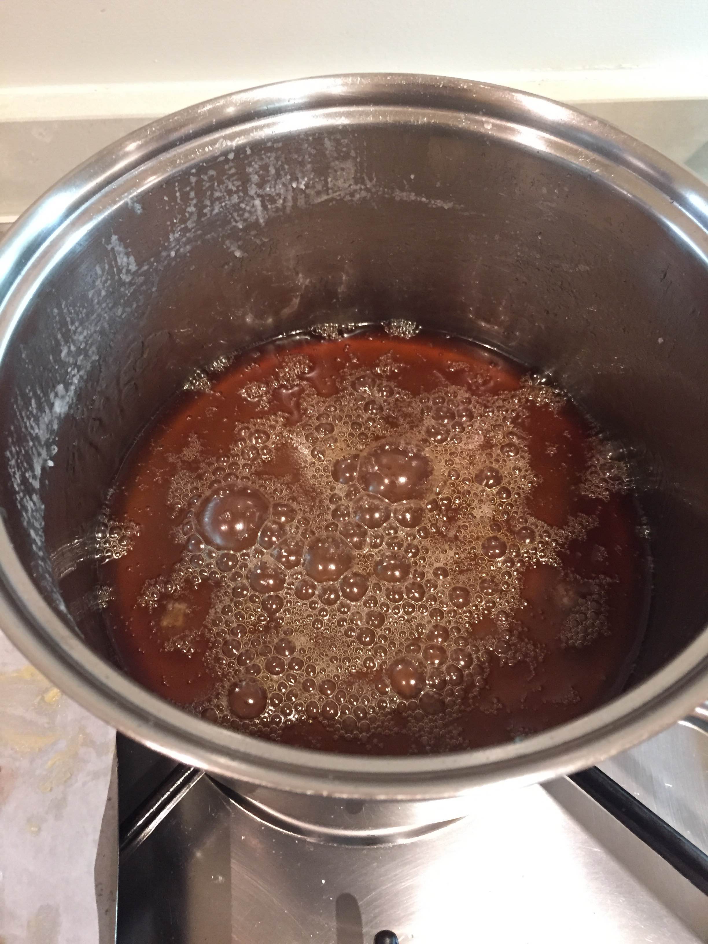 Place a saucepan on high heat and boil the butter, sugar and drinking chocolate. Remove cakes from the oven. Then pour the sauce evenly over the cake.
