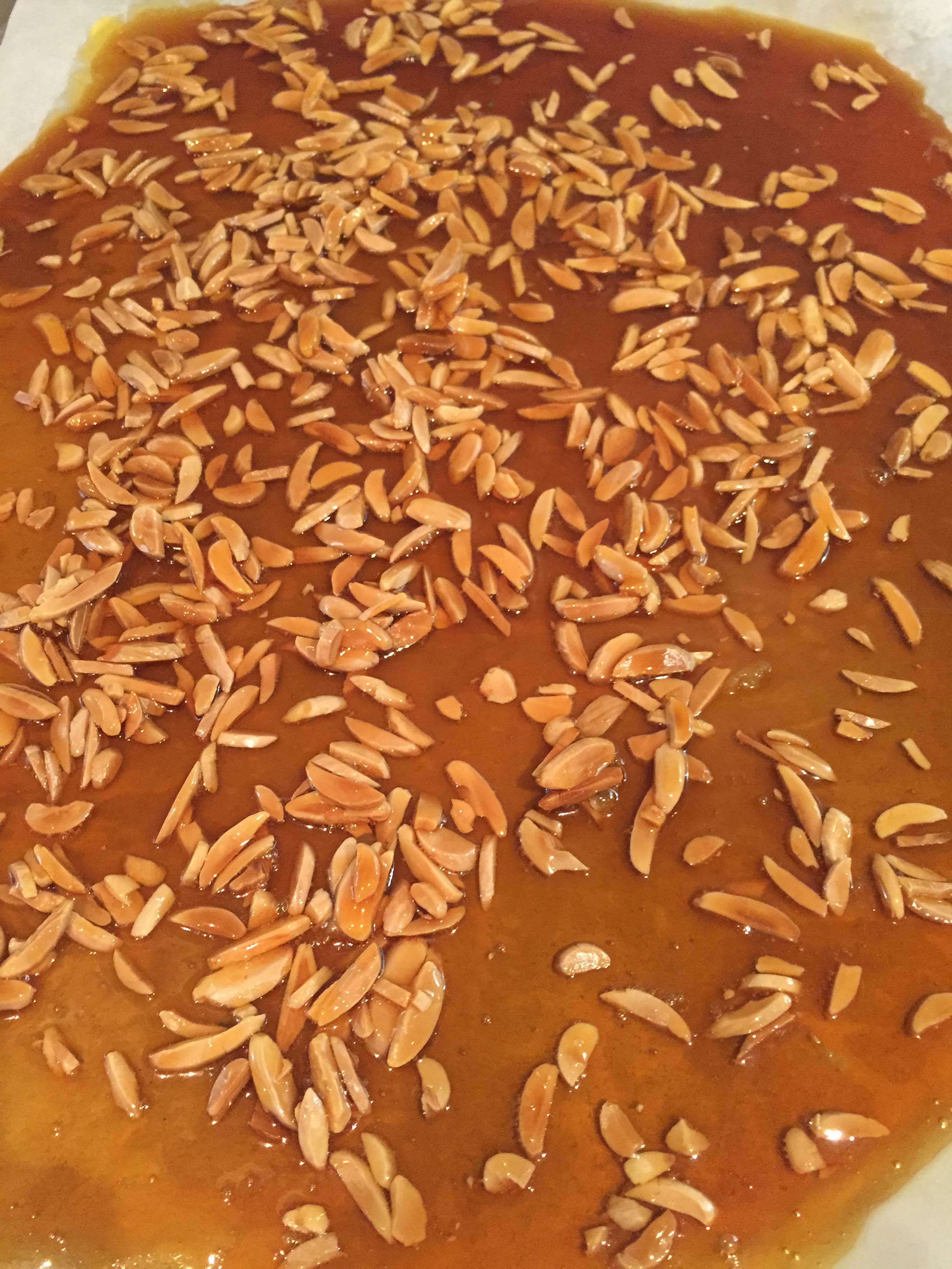 Once the cakes have finished cooking, place the almond in the oven for 7 minutes, or until golden (be careful not to burn).