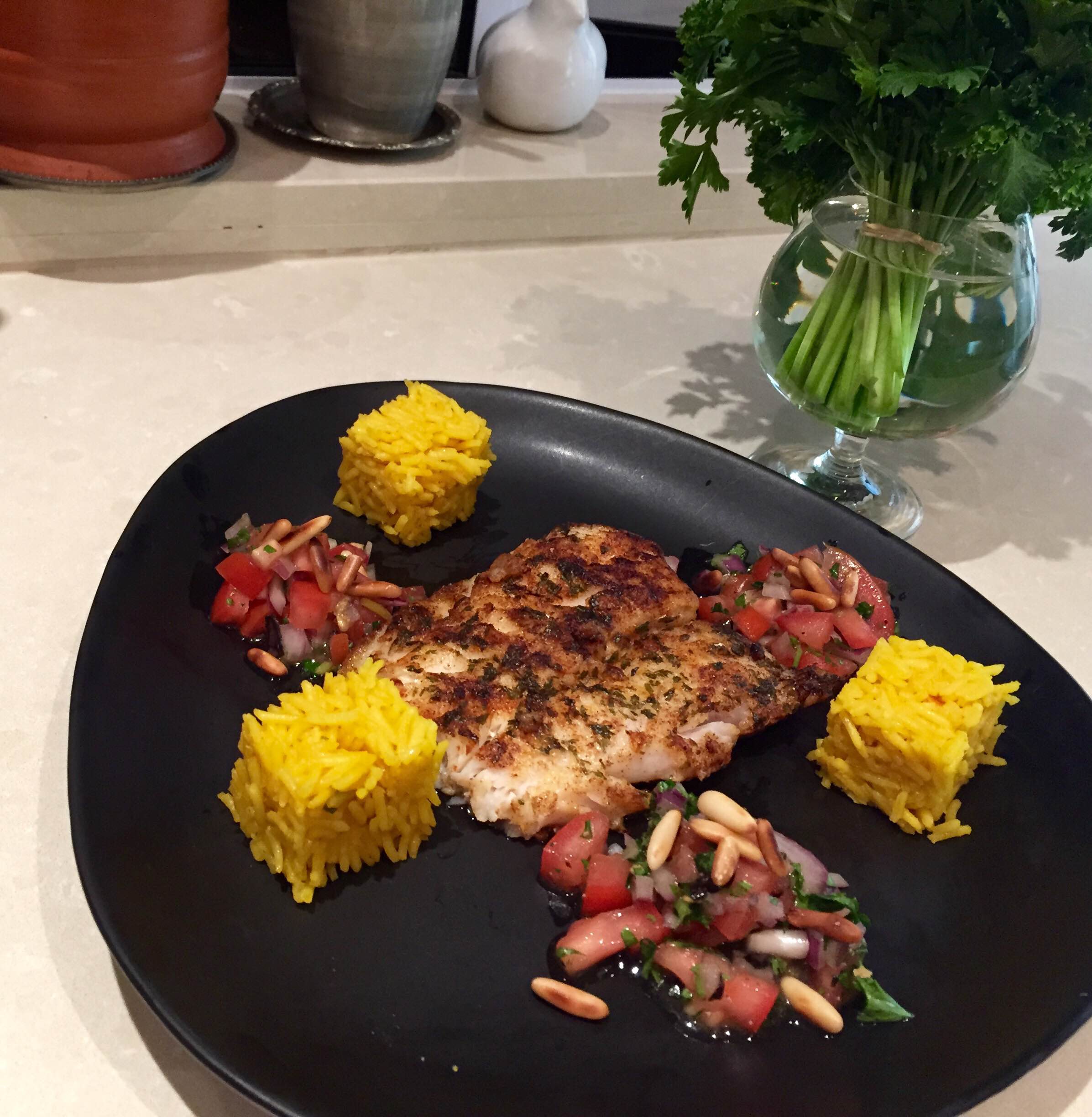 Now you’re ready to serve. Squeeze lemon juice over the fish and sprinkle the pine nuts over the salsa.