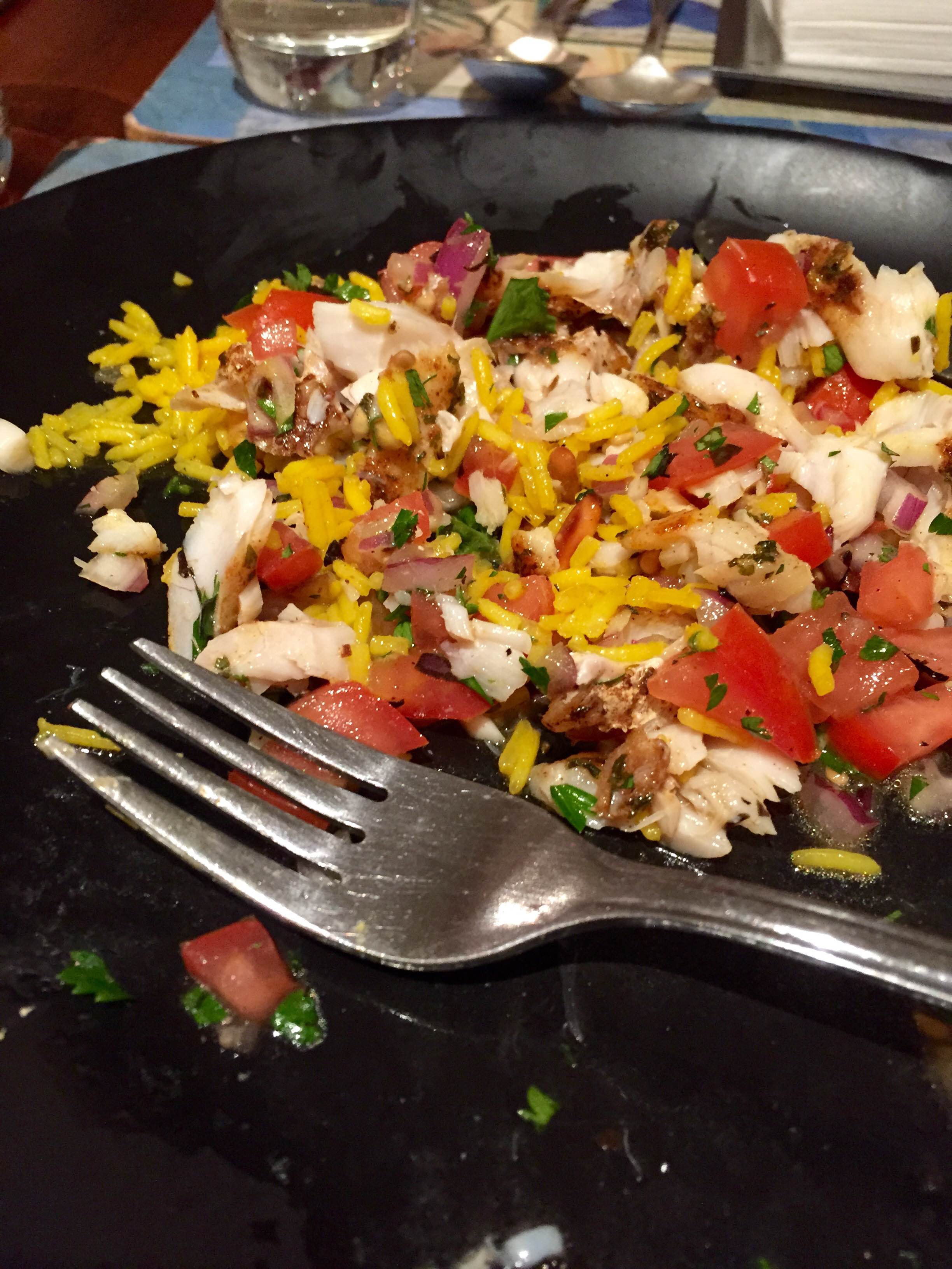 Hake is such a versatile fish, it literally goes with any spices and flavours. I decided to coat the fish with smoked paprika, course sea salt, dried parsley and lemon zest. The paprika gives the fish the most gorgeous colouring. I paired the fish with red onion and tomato salsa with turmeric rice. I was given a rice cube as a present and I finally got to use it π