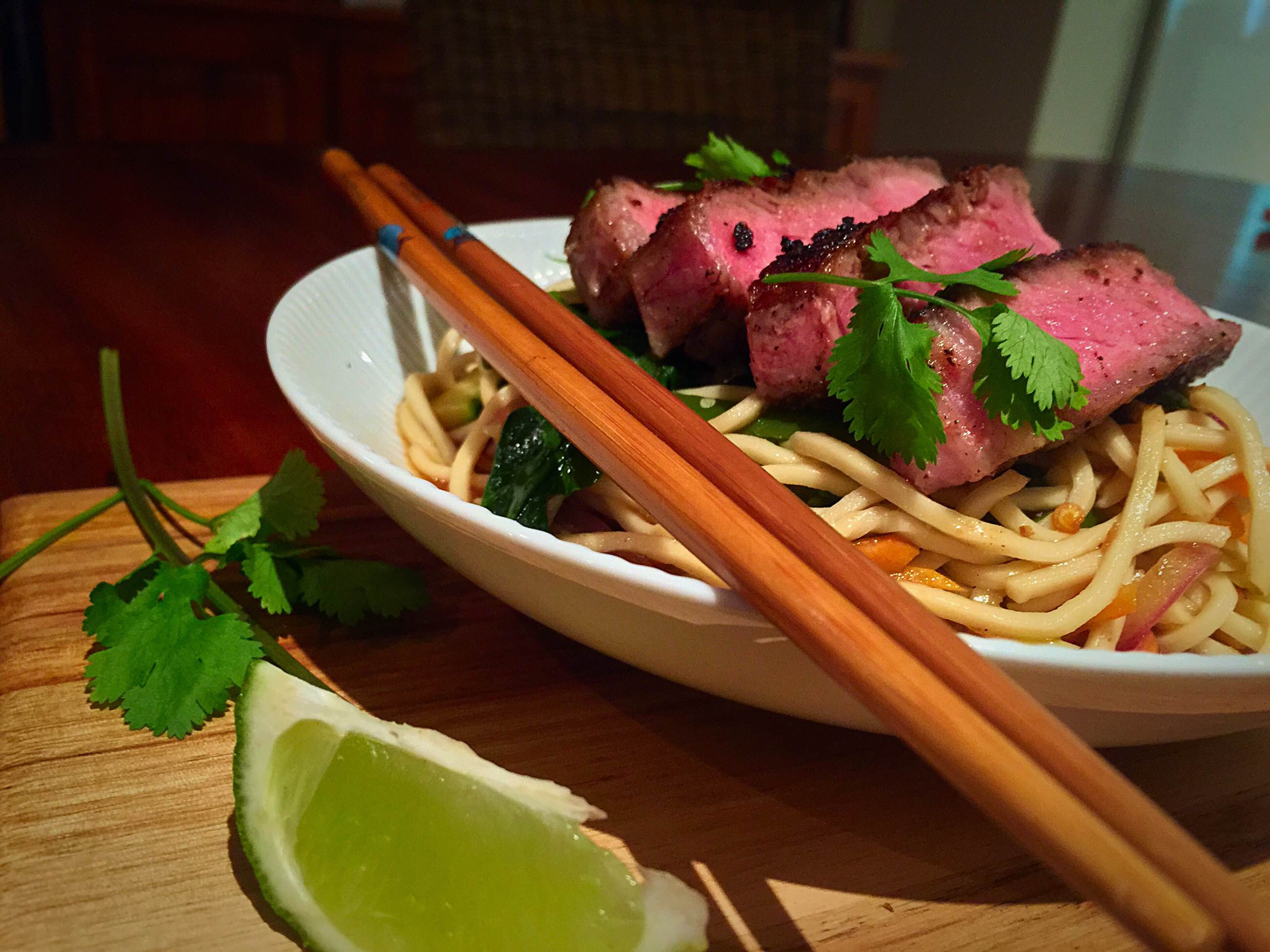 While the steaks are cooking, place the wok on high heat and add 1 tablespoon of olive oil. Fry the chilli and garlic for 30 seconds then add the veggies and teriyaki sauce. Cook for 2-3 minutes. Take the meat off and rest for 4 minutes. Then slice into bite sized pieces. Place the noodles into the wok and add the soya sauce, mix, then distribute noodles into bowls. Top with sliced meat, a wedge of lime and fresh coriander. Don’t forget to ladle some sauce over everything ❤