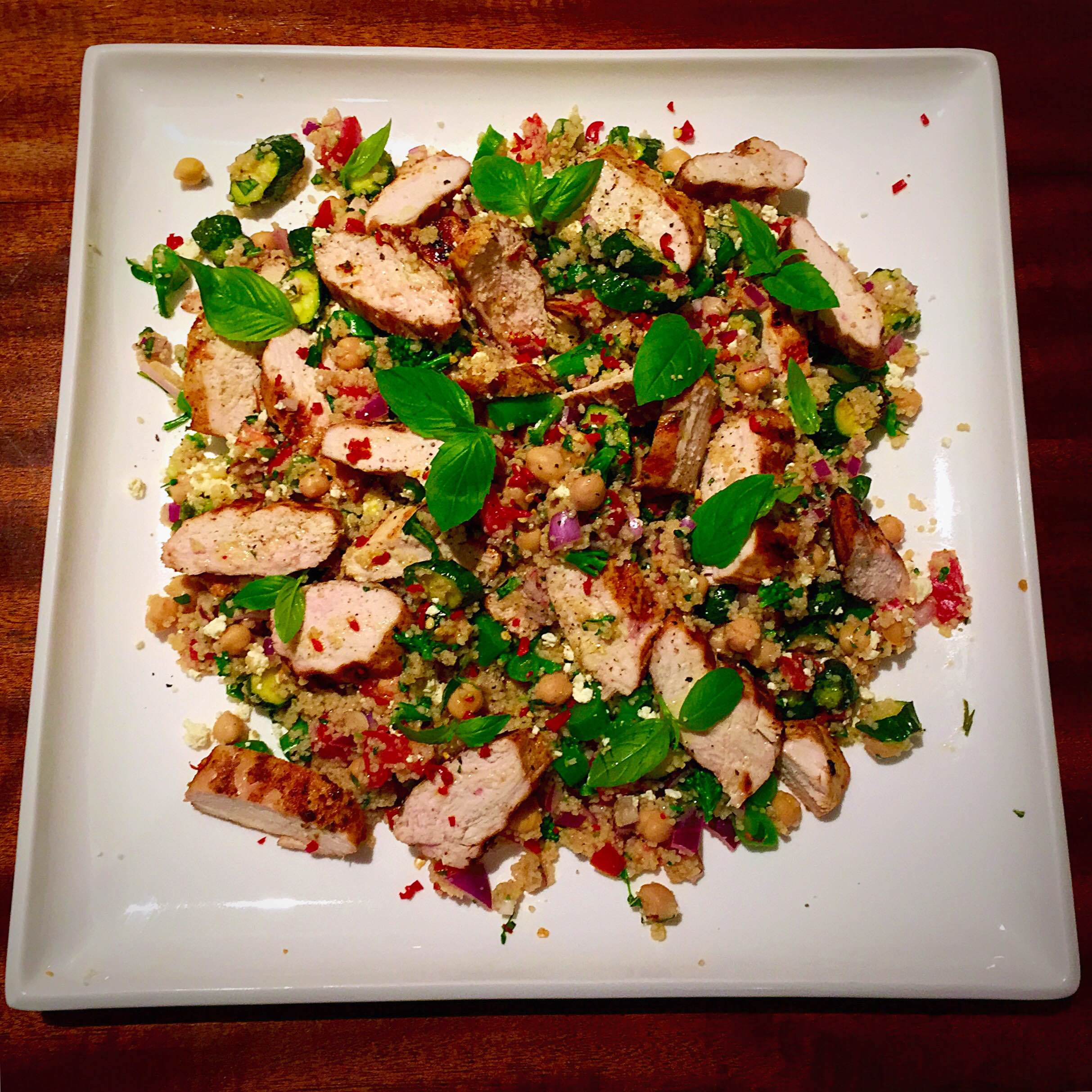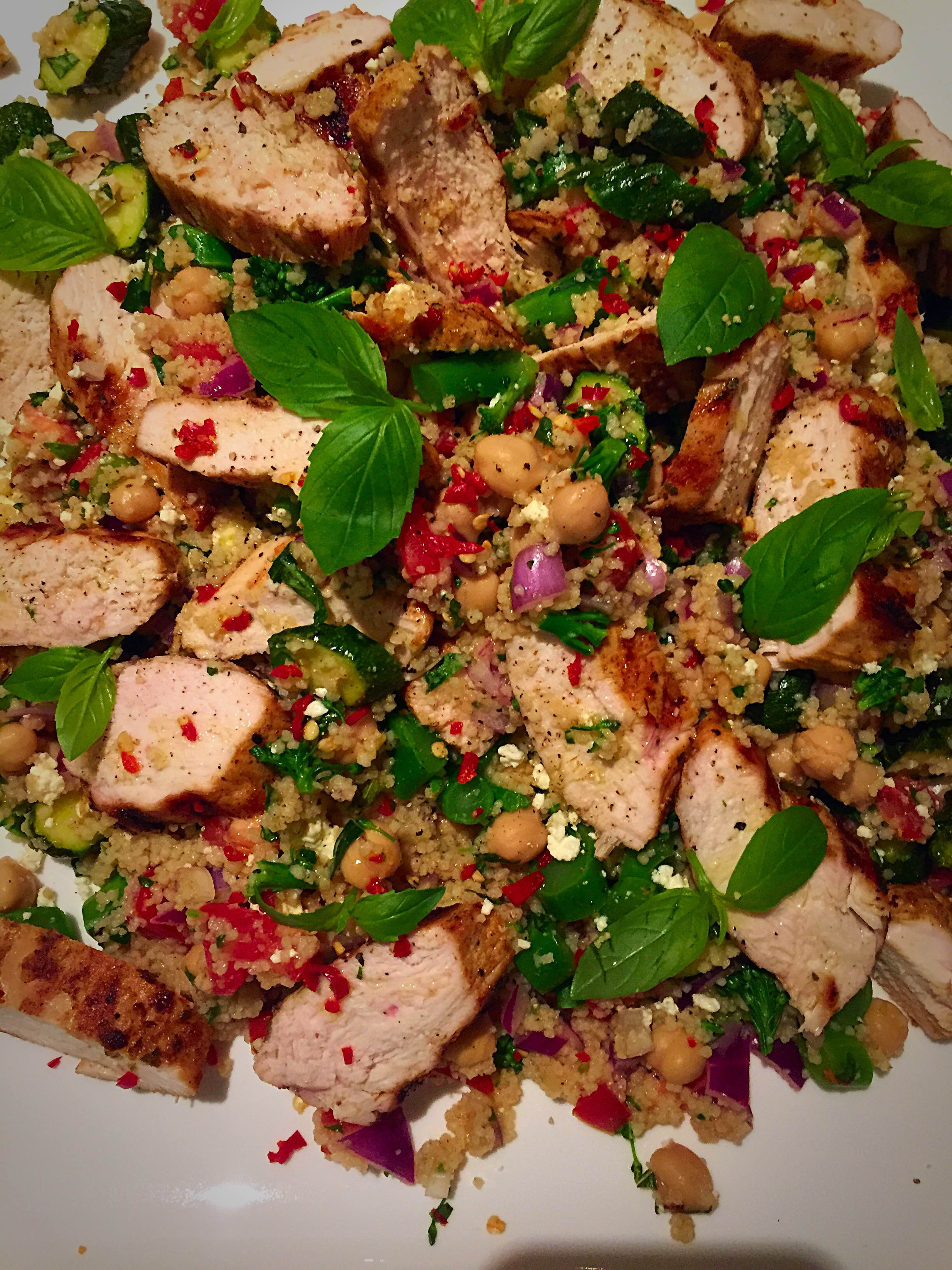 When the chicken has finished cooking, slice into strips and add to the bowl along the couscous, mix then transfer the salad to a platter. Top with crumbled feta, a drizzle of olive oil, a grind of black pepper, sea salt and sprinkle over baby basil leaves.
