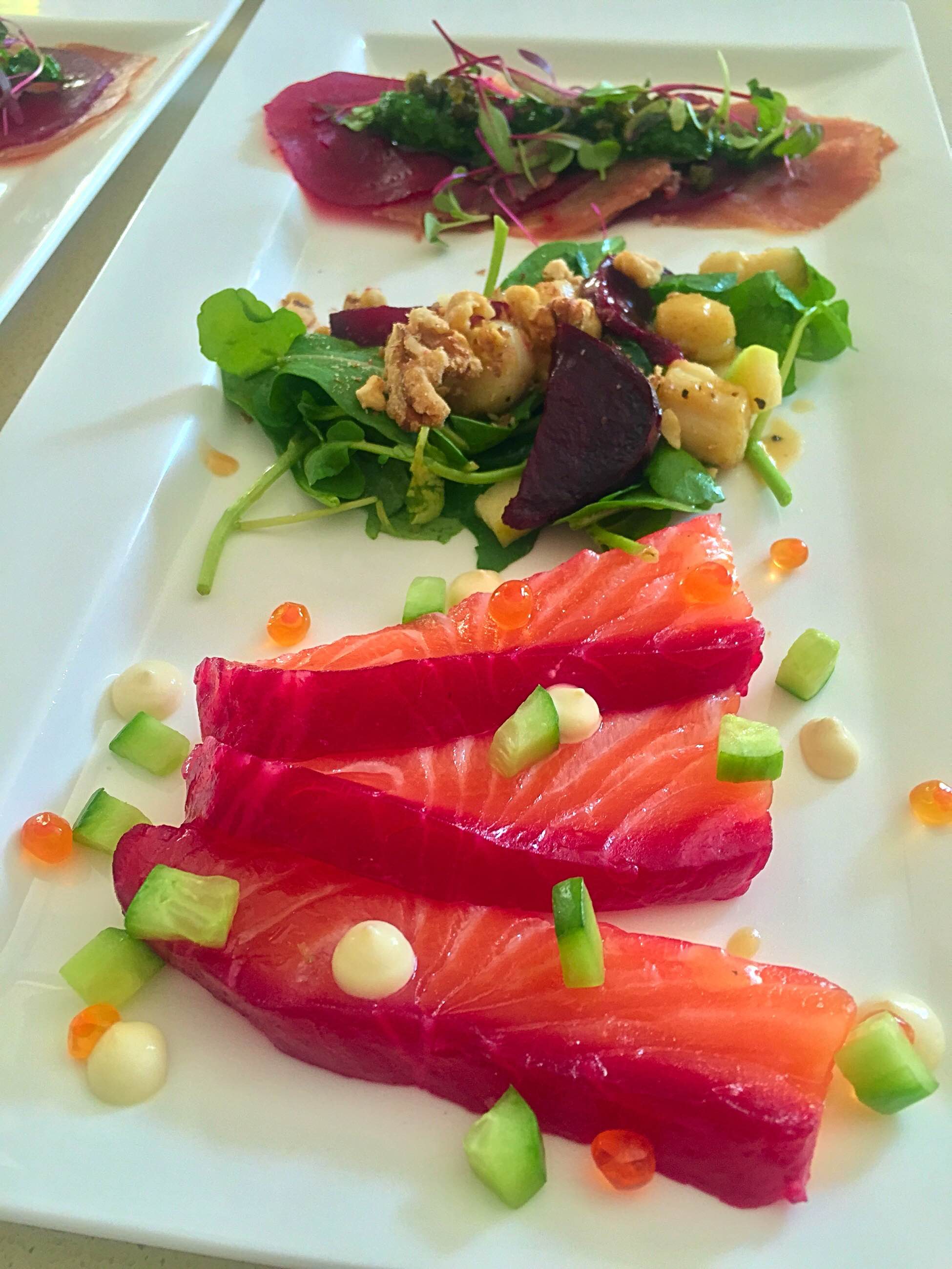 This is a real show stopper of a dish, the colour of the beetroot-cure salmon is absolutely spectacular. Although it takes 2 days to prepare, it takes no time to prep the cure and assemble it. I served the sashimi as part of a tasting plate but it is the perfect starter for a dinner party. Be prepared to blow your guests out of the water 😉