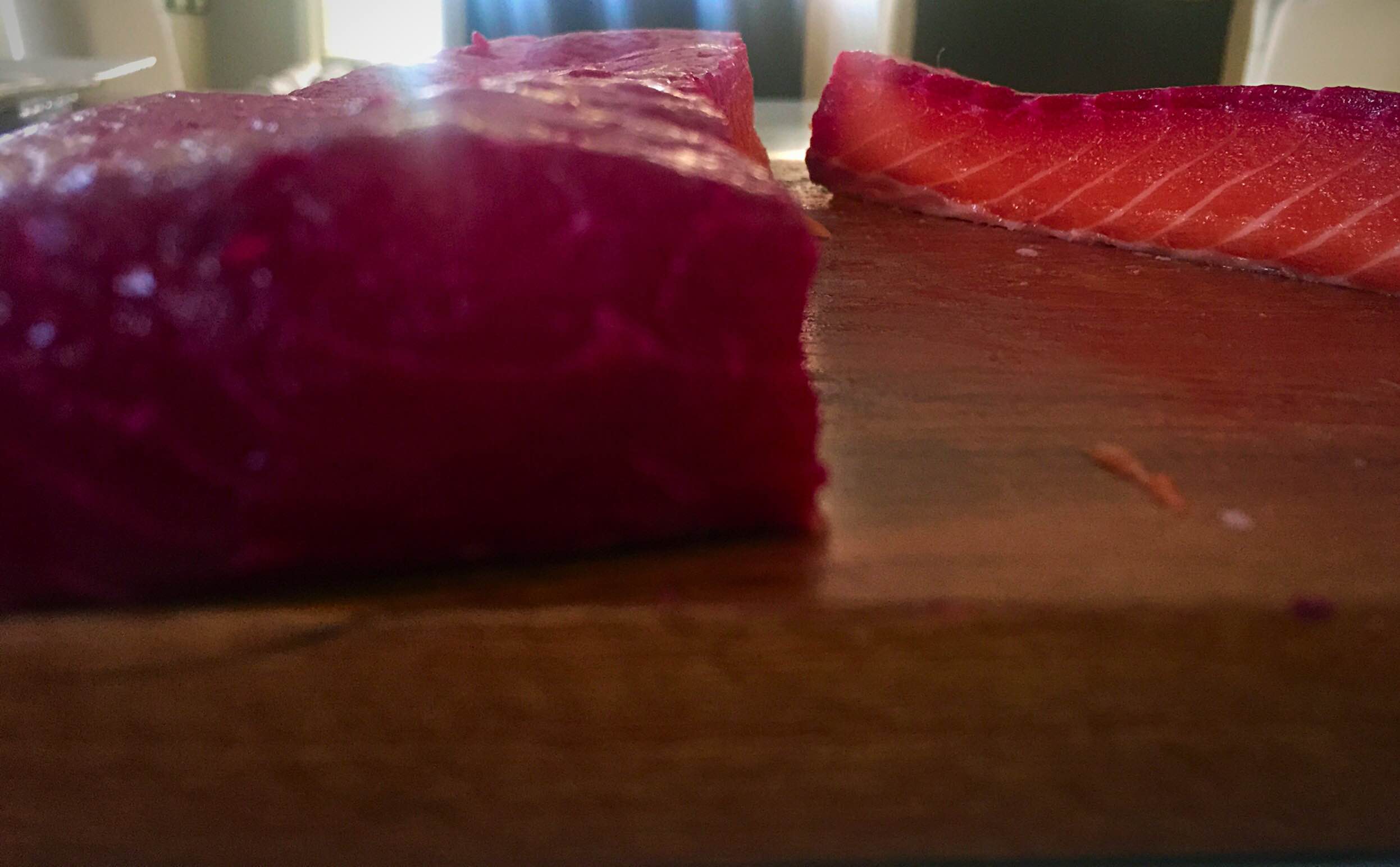 Once the salmon has cured for 48 hours, gently unwrap the salmon and use a spoon to get rid of the beet mixture. Gently splash the salmon with a bit of water to rinse off any remaining cure. Carefully cut the skin off the salmon. Slice the salmon in half and discard any thin uneven bits. Then cut into 3-5cm (depending on how thick you need it) pieces of sashimi.
