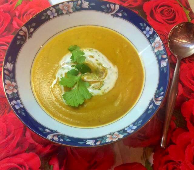 This soup is the bomb, the curry kick goes so well with the coconut milk and the coriander pesto, a delightful meal – good for starters or as a main meal for during the week.