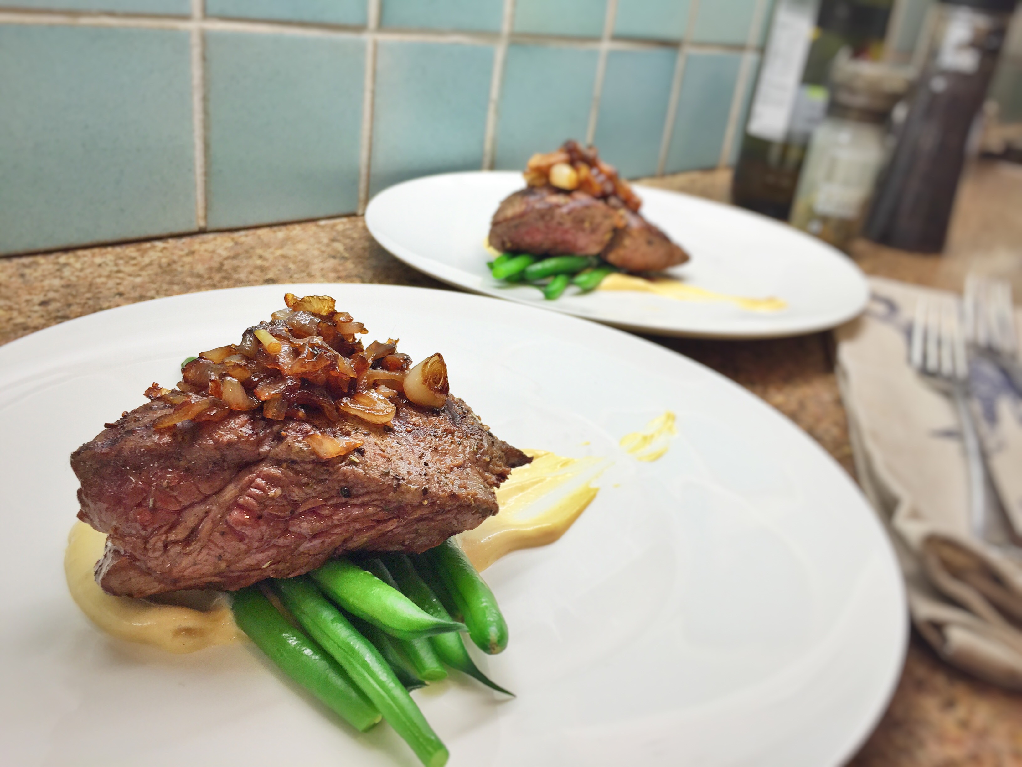 To serve place a tablespoon of mayo onto each plate, divide the beans and place the onions on top of the fillet and enjoy β€