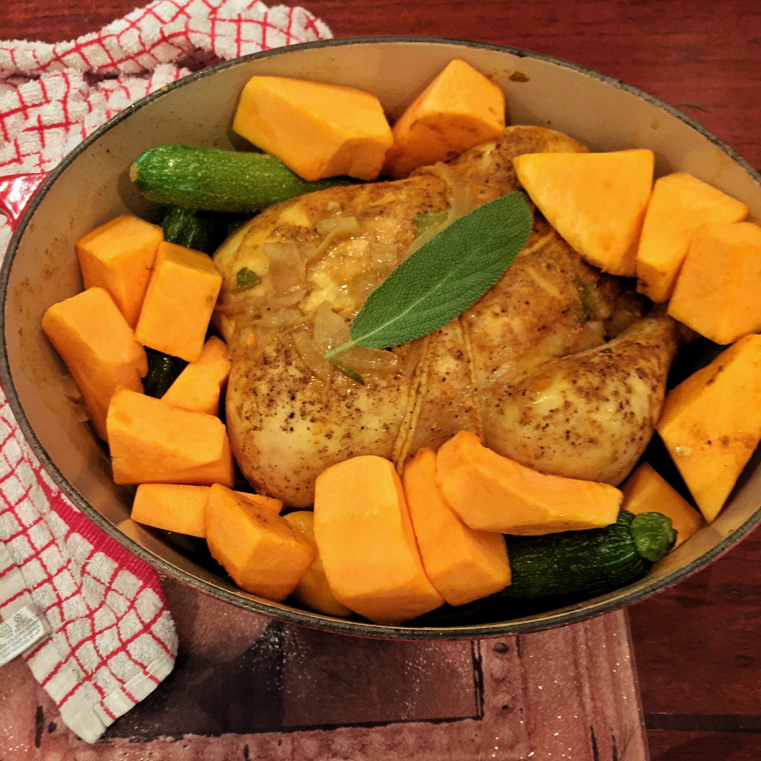 Then add the butternut, baby marrows and patty pans to the dish, spoon over the coconut milk and cook for another 20 minutes with the lid on.