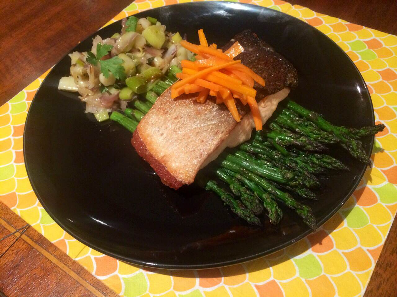 Time to serve, place the fish on top of the asparagus, add a generous squeeze of fresh lemon and top with the carrots and don;t forget the delicious leeks.